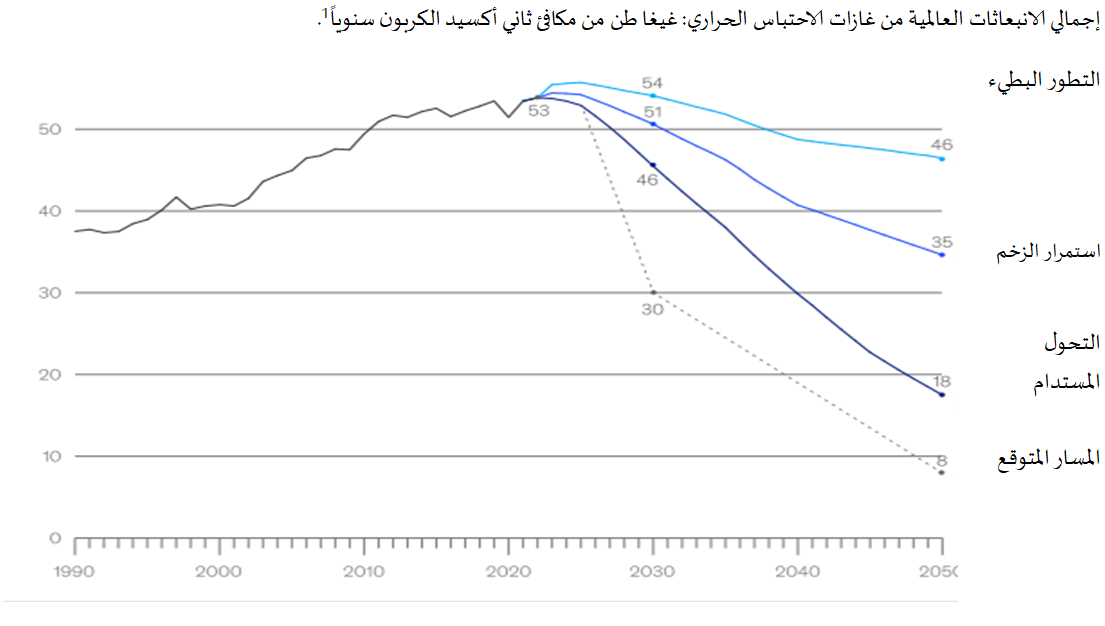 يُعزى هذا التحدي أساساً إلى ارتفاع الطلب على الطاقة والاعتماد المستمر على الوقود الأحفوري، ما قد يؤدي إلى زيادة الانبعاثات خلال الفترة من 2025 حتى 2035. وعلى الرغم من الجهود المبذولة حالياً، فمن المتوقع أن تشهد انبعاثات ثاني أوكسيد الكربون الناتجة عن الاحتراق والعمليات الصناعية ارتفاعاً حتى عام 2025 في جميع السيناريوهات التي خضعت للتحليل. وبعد هذا التاريخ، تبدأ مسارات الانبعاثات في التباين لكنها تظل أعلى من أهداف الحياد الكربوني بحلول عام 2050.