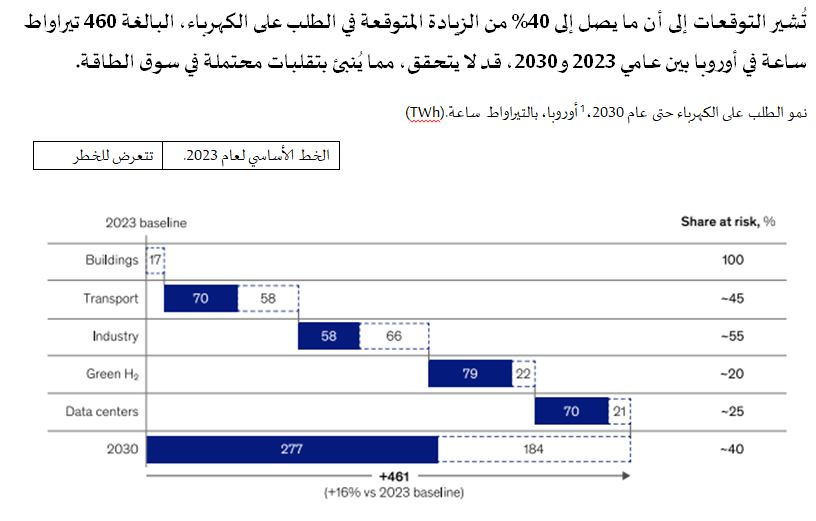 على الرغم من التوقعات بنمو الطلب على الكهرباء في أوروبا، فتحقيق هذا النمو لا يزال غير مؤكد بسبب عدة عوامل تساهم في خلق حالة من عدم اليقين، منها تباطؤ عمليات تركيب مضخات الحرارة، والمبيعات الأقل من المتوقع للمركبات الكهربائية، ونقص الاستثمارات في كهربة الصناعات، فضلاً عن التأخيرات في تطوير مشاريع الطاقة. إلى جانب ذلك، قد يؤدي الانخفاض المتوقع في الإنتاج الصناعي بالقطاعات الرئيسية، مثل الحديد والصلب والورق واللب والكيماويات، إلى تعقيد هذه التوقعات. هذا الغموض قد يؤدي إلى تراجع اهتمام المستثمرين في مشاريع الطاقة النظيفة المتطورة، ما قد يبطئ وتيرة التحول في قطاع الطاقة في المنطقة.