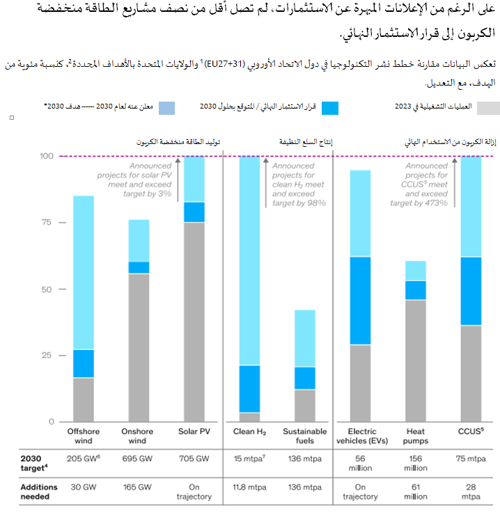 (1) تشمل البيانات دول الاتحاد الأوروبي (EU27) بالإضافة إلى النرويج وسويسرا والمملكة المتحدة. (2) يُعد نشر التكنولوجيا مقياساً لفهم الفجوة بين النشر الفعلي والاحتياجات المطلوبة. "قرار الاستثمار النهائي (FID) باستثناء المركبات الكهربائية ومضخات الحرارة (تعتمد المبيعات المتوقعة على متوسط المبيعات خلال السنوات الأخيرة). "الهدف المحدد لعام 2030 لكل من EU27+3 والولايات المتحدة؛ لا أهداف محددة للطاقة الشمسية والوقود المستدام ومضخات الحرارة، بالاستناد إلى سيناريو التحول المستدام من ماكنزي. *تشير إلى تقنيات التقاط الكربون واستخدامه وتخزينه. "بالغيغا وات. الأطنان المترية سنوياً. المصدر: الجمعية الأوروبية لمضخات الحرارة (EHPA)؛ إدارة معلومات الطاقة (EIA)؛ يوروستات؛ الوكالة الدولية للطاقة؛ Rystad؛ Wind 4C؛ حلول ماكنزي للطاقة؛ رؤى ماكنزي للهيدروجين".