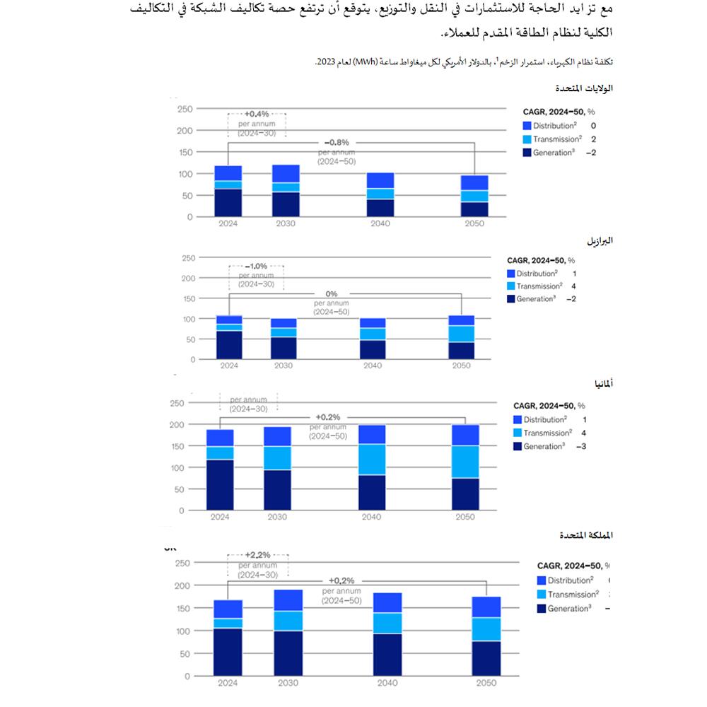 ولتحقيق هذا التوسع، يجب أن ترتفع استثمارات النقل والتوزيع بنحو ثلاثة أضعاف بحلول عام 2050 لتعويض نقص الاستثمارات السابقة ودعم الدمج المتزايد لمصادر الطاقة المتجددة المتقطعة. لكن هذا سيؤدي أيضاً إلى زيادة حصة تكاليف الشبكة في إجمالي تكلفة الكهرباء الموزعة للمستهلكين النهائيين. ومع زيادة هذه التكاليف ستبرز تحديات إضافية، مثل الازدحام ونقص العمالة، ما قد يؤثر على سرعة تطوير الشبكة وكفاءته. ويمكن أن تؤدي استراتيجيات إدارة الطلب دوراً محورياً في الحد من هذه الزيادات في التكاليف من خلال تسوية فترات الأحمال القصوى وتخفيف الضغط على الشبكة. ومع ذلك، قد تسهم إزالة الكربون من الشبكة ودمج نسبة أعلى من مصادر الطاقة المتجددة في خفض متوسط تكلفة توليد الكهرباء، وفي بعض الحالات قد يُعوّض ذلك عن التكاليف المتزايدة لشبكة الكهرباء ما يساهم في خفض التكلفة الإجمالية لنظام الطاقة.
