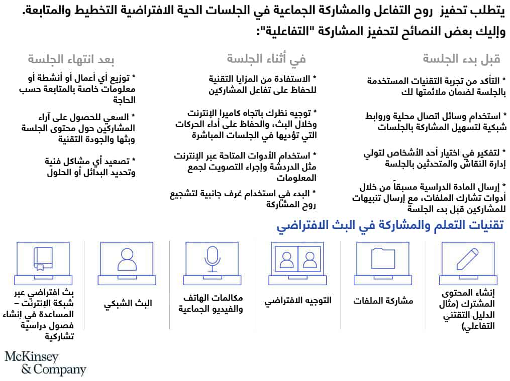 ولضمان استمرار وتمكين الجهود الرامية إلى تحقيق قيمة مضافة، يتخذ القادة المسؤولون عن العملية التعليمية عدة خطوات تكتيكية لضمان حماية الموظفين، ودعم البرامج التدريبية وتنفيذها، ولتطوير وتوسيع قاعدة التعلم الافتراضي التفاعلي. قبل تعرض العالم لجائحة "كوفيد-19"، لاحظنا انتشار التعليم الإلكتروني والافتراضي، وتزايداً ملحوظاً لمثل هذه البرامج، والتي يلجأ إليها العديد من الموظفين الشباب.