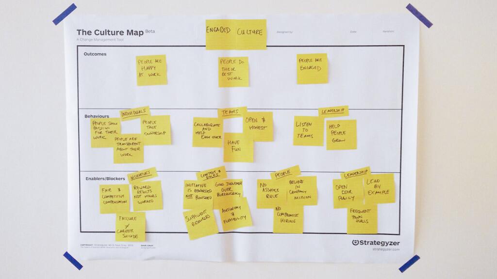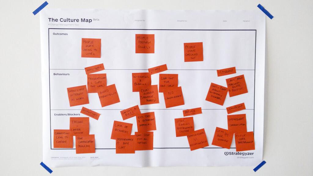 لتصميم ثقافة الشركة بطريقة منهجية، نستخدم أداة طورتها شركتنا استراتيجايزر (Strategyzer) وإيف بينيور بالتعاون مع غراي. نطلق على هذه الأداة "خريطة الثقافة" (Culture Map)، وهي تسهّل المناقشات حول الجوانب الثلاثة الأساسية للثقافة التنظيمية: