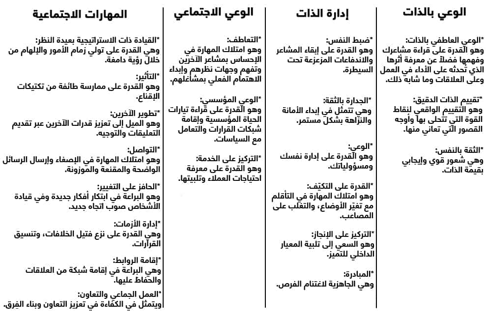 أبرز كفاءات الذكاء العاطفي التي يتحلى بها | السعي إلى الإنجاز والمبادرة وضبط النفس | الثقة بالنفس والتعاطف والحافز على التغيير | التعاطف وإقامة العلاقات والتواصل | التعاون وقيادة الفريق والتواصل | الوعي والسعي إلى الإنجاز والمبادرة | تطوير الآخرين والتعاطف والوعي بالذات |