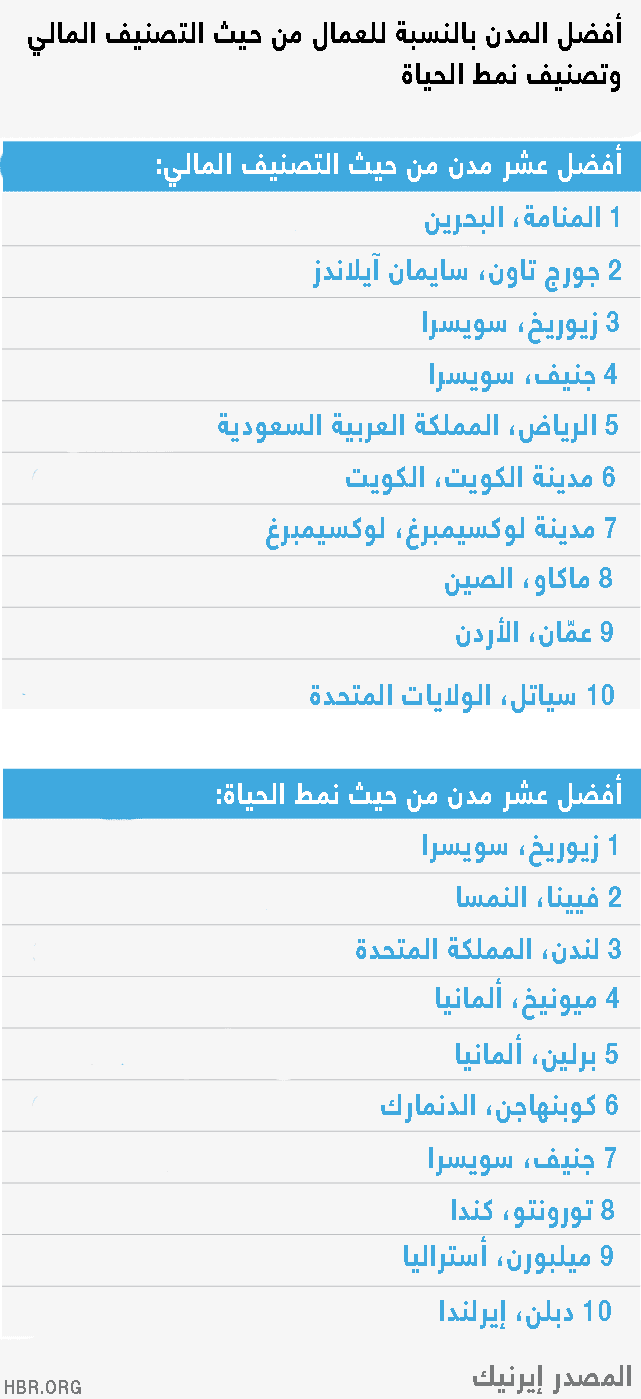أنشأت "إيرينك" (AIRINC)، وهي شركة أبحاث عالمية تعمل حالياً على المواهب الدولية واستراتيجيات الأجور مع أكثر من نصف الشركات المدرجة ضمن تصنيف 100، مؤشراً يساعد على الإجابة عن هذه الأسئلة. باستخدام بيانات مأخوذة عن فريق استبيان داخلي يجري باستمرار بحثاً عن أكثر من 400 مدينة حول العالم، حددت شركة "إيرينك" أفضل المدن للعمل (وأقلها) جاذبية للقوى العاملة في الوقت الحالي.