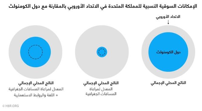 ويبقى التساؤل قائماً حول واقعية هذا الطرح الذي يزعم أن المملكة المتحدة ستكون قادرة على تحقيق مكاسب، عن طريق الحرية المطلقة في انفتاحها على خيار التفاوض مع دول الكومنولث، أو ما يُعرف بدول الإمبراطورية البريطانية السابقة مثل كندا وأستراليا والهند وجنوب أفريقيا، بشكل أكبر من خسارتها القدرة على الوصول إلى أسواق الاتحاد الأوروبي. قبل كل شيء، لاحظ أن الناتج الإجمالي المحلي الكلي لسائر دول الكومنولث لا يتجاوز 55% فقط من مثيله في الاتحاد الأوروبي. وهذا الفرق لا يصب في صالح الادعاء المذكور، كما هو موضح في الدائرة اليسرى في الرسم أدناه. بينما تعرض الدائرة الوسطى هذا الفرق بناءً على تأثير المسافة الفعلية، إذ إن الاتحاد الأوروبي أقرب بمقدار 8.4 مرة للمملكة المتحدة من دول الكومنولث. وتستخدم الدائرة الزرقاء، التي تظهر في الرسم البياني، تقديراً أكثر تفصيلاً لحساسية المسافة، بينما يدل الخط المتقطع على قياسات أكثر تحفظاً (مأخوذة من مئات الدراسات التي تخص صادرات البضائع). يقلل اتّباع القياسات الأخيرة "الأكثر تحفظاً" من الحصة السوقية المحتملة لدول الكومنولث مقارنة مع الاتحاد الأوروبي أكثر وأكثر، ليتدنى إلى نسبة أقل من 2%.