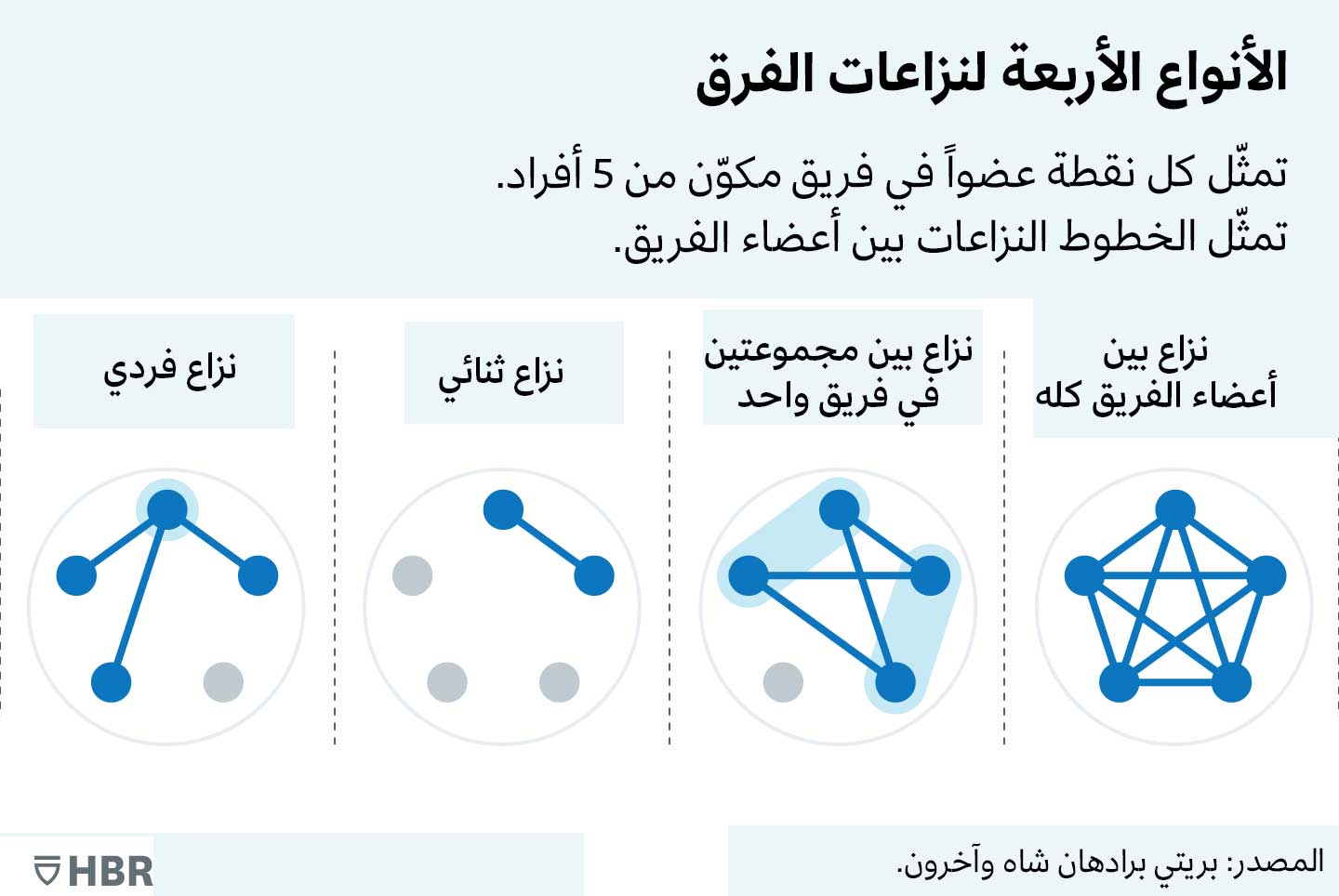 توصلنا إلى 4 أنواع شائعة تغطي معظم نزاعات الفرق تقريباً، على الرغم من الاختلافات في الثقافة ومضمون قضايا النزاع. وتظهر دراساتنا أيضاً أنه عندما يتخذ المدراء دوراً استباقياً في حل النزاع بأسلوب يحترم مصالح الفريق كله، فقد تكون النتائج إيجابية وتُسفر عن زيادة الثقة بين أفراد الفريق، واتخاذ قرارات أفضل تُنفّذ بفعالية أكبر. وإليكم أنواع النزاع الأربعة وكيفية إدارة كل منها.