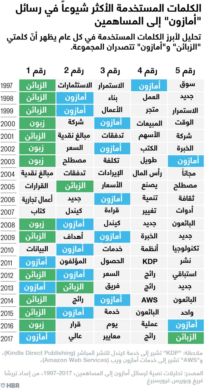 عادة ما يصف المحللون شركة "أمازون" على أنها واحدة من أكثر الشركات الذين صادفوها تركيزاً على الزبون، ووصفها أحدهم بأنها "شركة مبتكرة تبدأ بالتفكير حول ما يمكن أن يجعل حياة الزبائن أكثر سهولة". وبناءً على ذلك، قررنا اختبار الرسائل لمعرفة مدى تركيز "أمازون" على الزبون مع مرور السنوات، من خلال حساب عدد مرات استخدام كلمة "زبون" في كل رسالة من الرسائل إلى المساهمين. ووجدنا بالفعل أنّ كلمة "زبون" هي الكلمة المستخدمة الأكثر شيوعاً في جميع الرسائل، ويليها كلمة "أمازون" و"جديد" و"عمل".