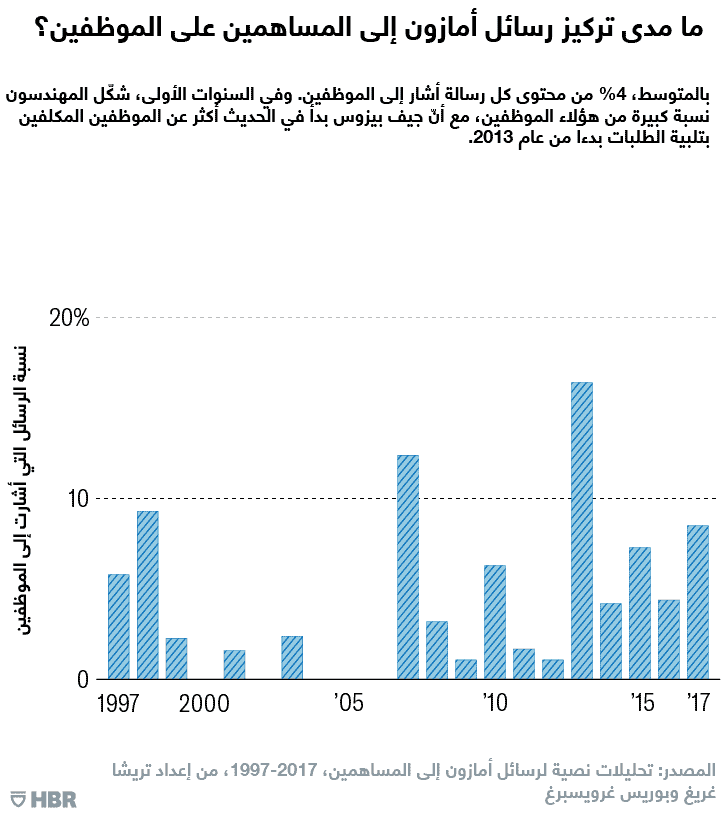 كان موضوع الموظفين هو الموضوع الثاني المهم في رسائل "أمازون" إلى المساهمين، حيث وجدنا 48 إشارة منفصلة إلى "الموظفين" بشكل عام، وهو ثالث أعلى رقم من الإشارات بعد الزبائن والتجزئة. وفي المتوسط، خصّص بيزوس 4.2% تقريباً من كل رسالة للحديث عن الموظفين بمتوسط 2.4% وحد أعلى 16% في رسالته لعام 2013 (انظر المخطط أدناه). وقد أشادت معظم إشارات بيزوس إلى الموظفين بشكل عام بفريق الهندسة في "أمازون". وتنسجم هذه النتيجة مع ما أفاد به براد ستون في كتاب "متجر كل شيء" (The Everything Store)، والذي وثّق فيه مدى شراسة "أمازون" في منافستها مع شركات مثل "جوجل" لاستقطاب المواهب في مجالي الهندسة والإدارة خلال سنواتها الأولى.