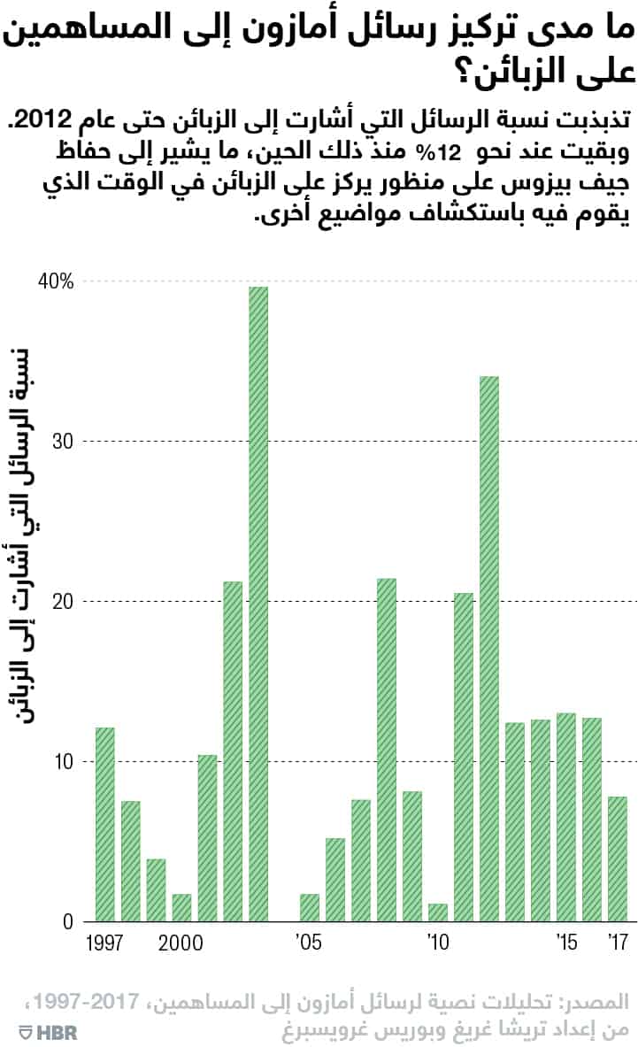 لاحظنا أنّ عدد الإشارات إلى الزبون لم يكن منسجماً على مر السنوات، ولم يستقر سوى في الآونة الأخيرة (انظر الشكل رقم 2 أدناه). في ذروة رسالته، جعل بيزوس 40% من رسالته للحديث عن الزبائن، أما في السنوات الأخرى فقد تحدث بنسبة أقل عنهم، بما يعادل 5% من إجمالي النص. وبدءاً من عام 2013، خصّص بيزوس باستمرار أقل من 15% من رسائله للحديث عن الزبائن.