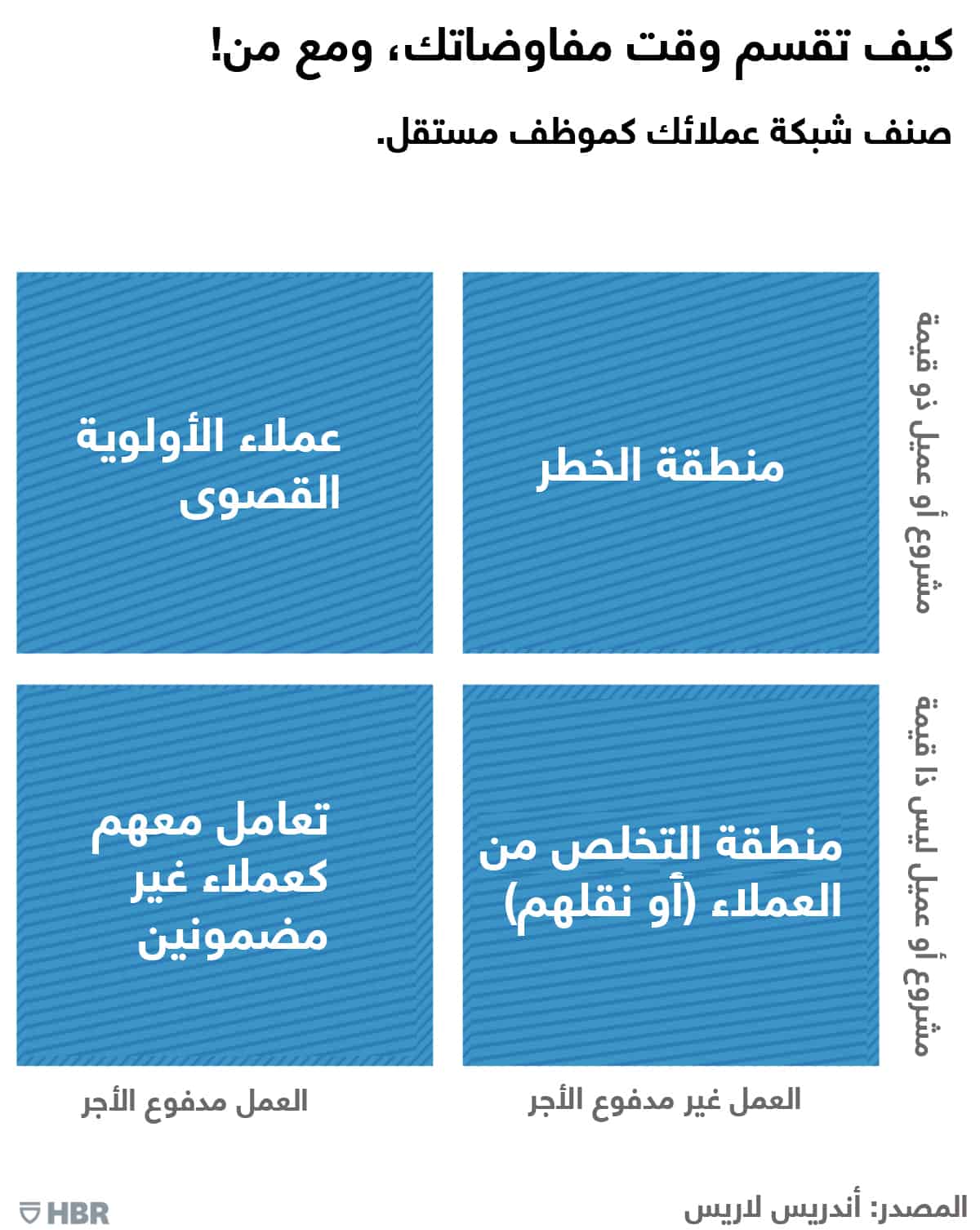 فعندما تتواصل مع عميل محتمل وتتفاوض معه، ضع في اعتبارك المعيارين الأساسيين لتحديد قدر الجهد الذي ستكرسه له: وهما الأجر المدفوع، والقيمة. فالأجر هو ببساطة مقدار المال الذي تتوقع استلامه إذا سار التعاقد على ما يرام. فكلما زاد قدر الأجر، زاد قدر الوقت والطاقة الذي يمكنك تبرير إنفاقه على المفاوضات. أما القيمة فهي أشياء أقل وضوحاً: فقد تشير إلى مدى تقدير العميل لعملك وجهدك، أو مقدار شغفك الشخصي بالمشروع.