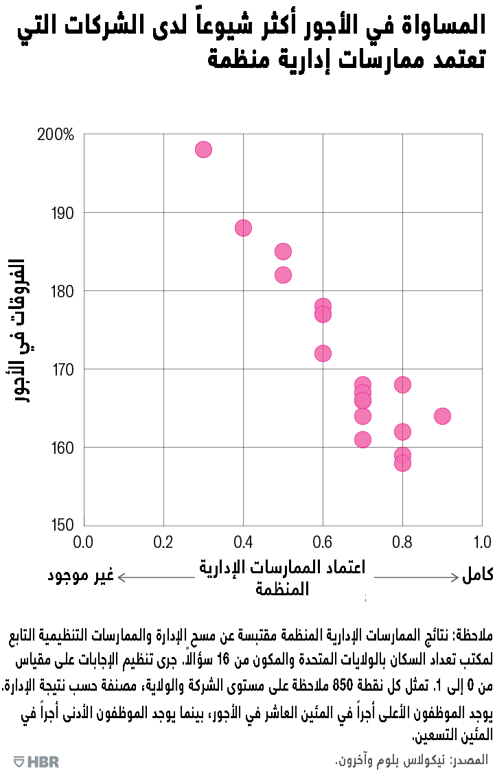 ووجدنا أن الشركات التي تمتلك ممارسات إدارية أكثر تنظيماً حسب مسح الإدارة والممارسات التنظيمية دفعت لموظفيها أجوراً أكثر إنصافاً، بقياس الفرق بين أجور الموظفين لدى أعلى 90% وأدنى 10% في كل شركة.