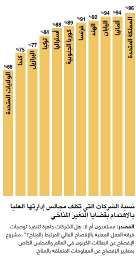 وجدت دراسة أجريت على 1,681 شركة أن 82% منها توجه مجالس إدارتها للاهتمام بالمخاطر والفرص المرتبطة بالمناخ. وتحت تلك النسبة العامة هنالك فروقات جغرافية واضحة، حيث تعد الشركات الأوروبية أكثر ميلاً بكثير من سواها إلى الاهتمام بهذا الأمر.