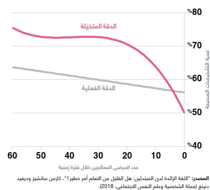 قد تشكل الثقة الزائدة بالنفس مشكلة حقيقية. ويظهر أحد الأبحاث الجديدة كيفية حصول ذلك. ففي تجربة حول التوصل إلى التشخيص الطبي، كان المشاركون الذين لا يتمتعون بالخبرة يبدؤون عملهم بثقة منخفضة جداً بأنفسهم، لكنهم بعد تحقيق عدد قليل من النجاحات باتوا يشعرون بأنهم خبراء أكثر مما هم في الواقع – وهو ما يسميه الخبراء "فقاعة المبتدئين". ويظهر الشكل أدناه سرعة نمو شعور المشاركين بدقة تشخيصهم وتخطي ذلك الشعور لواقع مهاراتهم الحقيقية.
