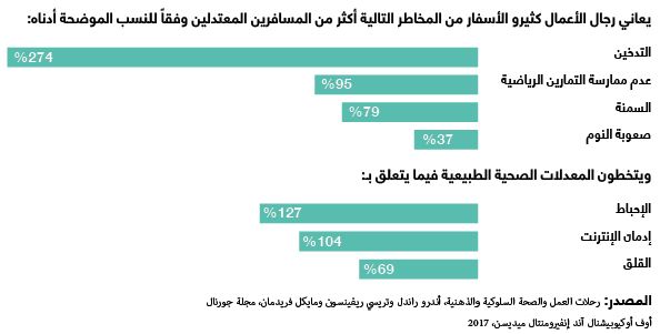 بلغت رحلات العمل المحلية التي قام الأميركيون بها عام 2016 أكثر من 500 مليون رحلة. ورغم توفير الكثير من برامج تعزيز الصحة المهنية الخاصة برحلات العمل من لقاحات ومعلومات حول تجنب الأمراض المنقولة بالأغذية وإصدارها تحذيرات بشأن الاضطرابات المدنية أو السياسية، إلا إنه قلما تركز هذه البرامج على الأخطار الأخرى الأكثر انتشاراً: مثل الإجهاد والنوم المتقطع والطعام والشراب غير الصحي وعدم ممارسة التمارين الرياضية، التي تعد آثاراً سلبية يتعرض لها المسافرون على الطريق. ولتوضيح التأثيرات الصحية الناجمة عن كثرة الأسفار، استخدم الباحثون بيانات من نتائج الفحوصات الطبية الوقائية والفحوصات الصحية الشاملة وخطط السلامة الصحية. ويعقد المخطط التوضيحي التالي مقارنة بين المخاطر التي يتعرض لها كثيرو الأسفار، الذين يقضون 21 ليلة أو أكثر في الشهر في رحلات خاصة بالعمل، والمخاطر التي يواجهها من يقضون ليلة إلى ست ليال شهرياً في رحلات العمل.