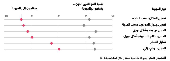 يعلم أرباب العمل أنّ الموظفين يبحثون على المرونة، وتدعي الكثير من الشركات توفيرها لهم. إلا إنّ الكثير ممن يحتاجون إلى المرونة لا يمكنهم الحصول عليها. ولفهم هذه المشكلة بشكل أفضل، قام باحثون في شركة ويرك (Werk)، وهي شركة ناشئة تستخدم التكنولوجيا لإقامة أماكن عمل تتميز بالمرونة، بإجراء استطلاع على 1,583 موظفاً إدارياً يمثلون القوى العاملة في الولايات المتحدة. يوضح الرسم البياني أدناه الفجوة بين المرونة التي يحتاجها الموظفون والمرونة التي يسمح بها أرباب العمل.