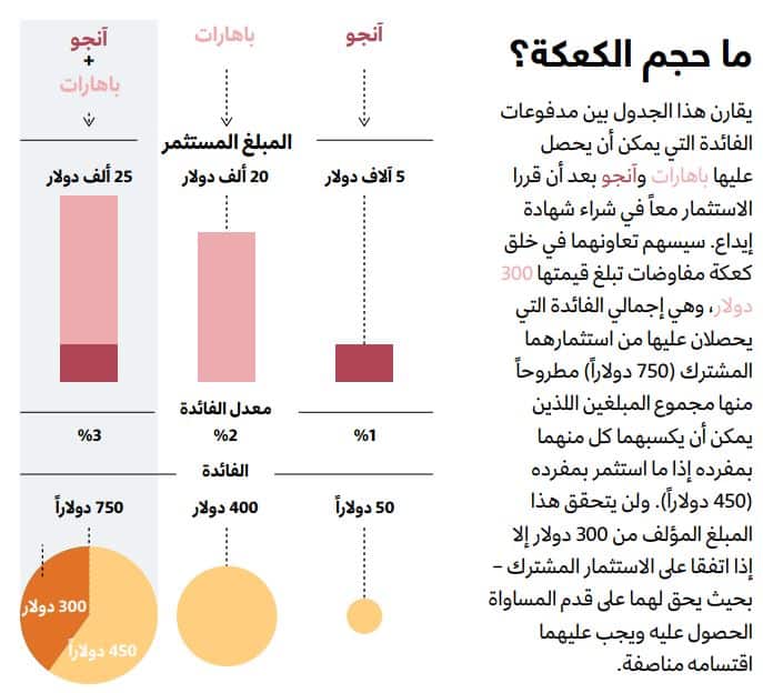 في تلك اللحظة، عرض باهارات تقاسم الفارق بين مقترحه ومقترحها وإعطاء آنجو 175 دولاراً من الفائدة التي سيحصلان عليها. وبما أن الحل الذي يقع في مكان ما بين الإنصاف وعدم الإنصاف يظل حلاً غير منصف، فإن آنجو لم تكن مستعدة للاستسلام بعد، فقالت له: "تخيّل يا بارهارات لوهلة أن شهادة الإيداع التي تبلغ قيمتها 25 ألف دولار تعطي ذات الفائدة التي تعطيها شهادة الإيداع التي تبلغ قيمتها 20 ألف دولار أي 2%، وبالتالي نكون أمام 500 دولار يجب أن نتقاسمها. بموجب ذلك السيناريو، سيظل من المنطقي أن نستثمر أموالنا معاً لأن ذلك سيحقق لنا 50 دولاراً إضافية من معدل فائدة يبلغ 2% على مساهمتي بمبلغ 5 آلاف دولار عوضاً عن 1%. لكن هذا العرض لن يكون منطقياً في نظرك بموجب الخطة التي تقترحها حيث سيكسب كل واحد منّا 2% على الأموال المستثمرة. وهذا سيعني أنك ستظل تحصل على 400 دولار، وأنا سيزداد مبلغي من 50 دولاراً إلى 100 دولار. وأنا سأحصل على جميع المكاسب. وهذا لن يكون منصفاً بالنسبة لك. عوضاً عن ذلك سوف أتقاسم الخمسين دولاراً الإضافية معك". (راجعوا الفقرة الجانبية بعنوان "ما حجم الكعكة الجديدة؟").