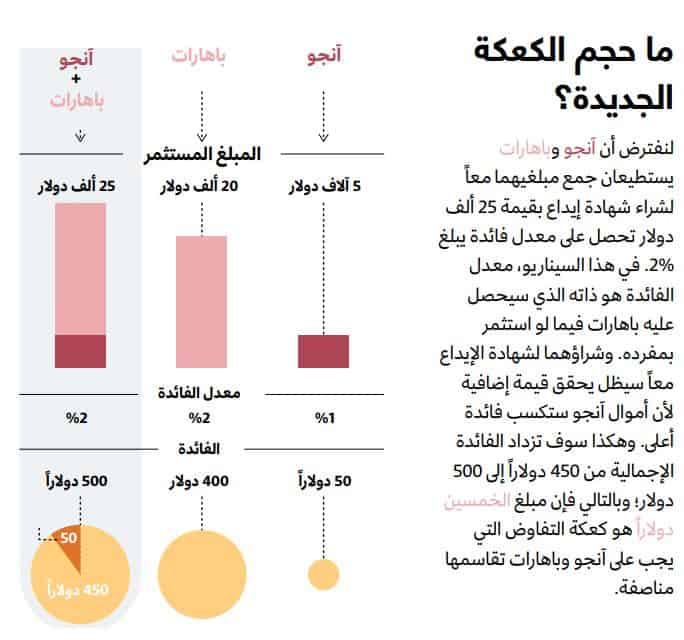 اتفق الاثنان بسرعة على أنه من المنطقي أن يجمعا مبلغيهما معاً وأن يستثمرا سوياً. وبقليل من البحث على الإنترنت، اكتشفت آنجو أنهما يستطيعان الحصول على معدل فائدة أفضل يبلغ 3% إذا ما اشتريا شهادة إيداع بقيمة 25 ألف دولار. وأصبح عليهما الآن أن يحددا كيف سيقتسمان الفائدة البالغة 750 دولاراً بينهما (راجعوا الفقرة الجانبية بعنوان "ما حجم الكعكة؟")