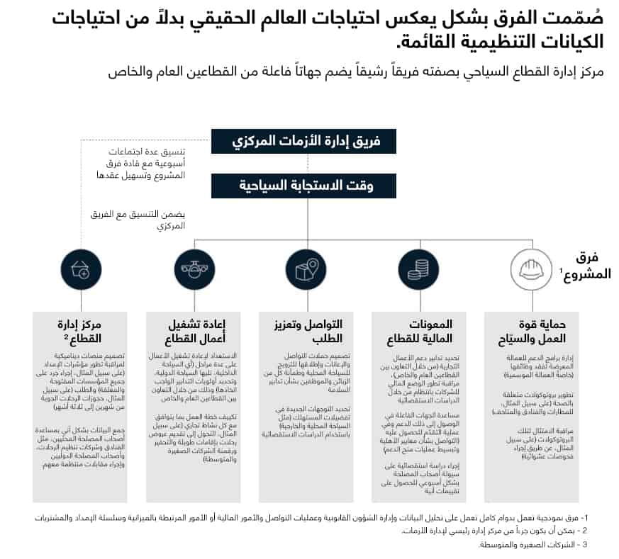 إن تركيز القيادة الفاعلة في مركز إدارة رئيس يمثّل استجابة لإدارة الأزمات التي نفذتها العديد من المؤسسات في مواقف مماثلة. ويمكن لمراكز إدارة الأنشطة السياحية الذي يجمع بين الجهات الفاعلة العامة والخاصة وشبه الخاصة في فرق المشاريع لمعالجة القضايا الخمسة، أن يوفر إطار عمل تعاوني فاعل يتناسب مع مختلف أصحاب المصلحة ضمن قطاع السياحة (الشكل 1).