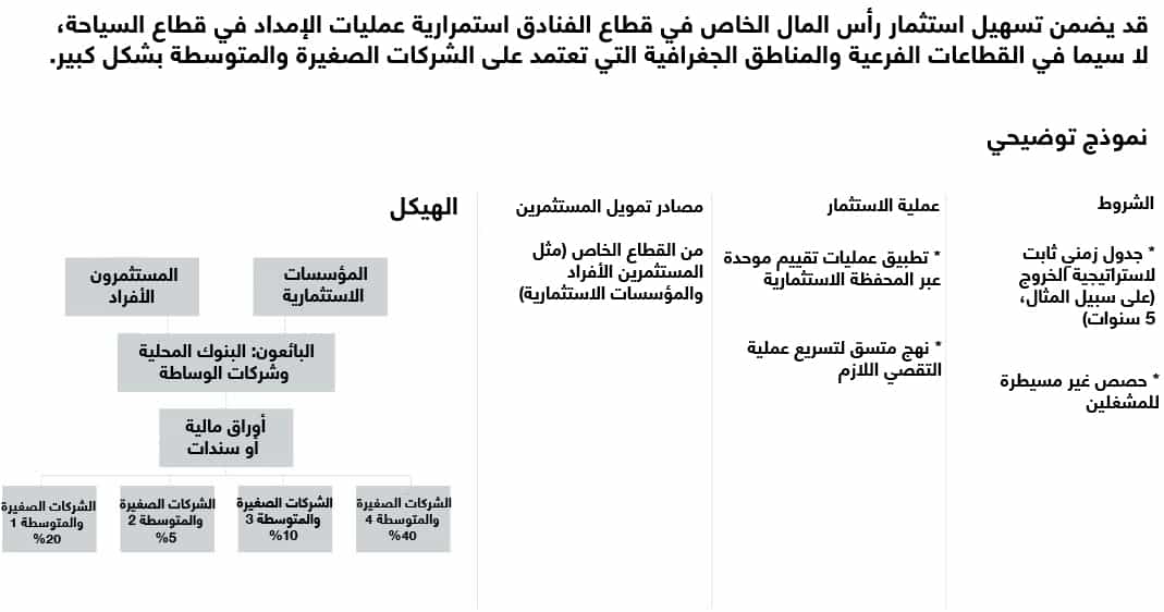 يمكن أيضاً استخدام صناديق الأسهم المدعومة من الحكومة لتوظيف رأس المال الخاص للمساعدة في ضمان مواصلة الشركات الصغيرة والمتوسطة ذات الصلة بالسياحة أعمالها في ظل الأزمة (الشكل 2). ويدعم هذا المبدأ إطار العمل المؤقت للمفوضية الأوروبية لإعادة رسملة الشركات المدعومة من الدولة، والتي قدمت ما يقدر بحوالي 1.9 تريليون يورو كمساعدة لاقتصاد الاتحاد الأوروبي بين شهري مارس ومايو عام 2020.5 ويتطلب تطبيق مثل تلك الآلية على الشركات الصغيرة والمتوسطة إنشاء هيكل مناسب لأسهم رأس المال، أو توريق حصص الملكية في العديد من الشركات الصغيرة والمتوسطة في وقت واحد، وهو ما يقلل من مجموعة المخاطر العامة التي قد تواجه المستثمر. إضافة إلى ذلك، فإن تطوير منهجية تقييم موحدة من شأنه إلغاء عمليات التقصي اللازمة والمطولة على كل أصل. ويمكن للحكومات التي لا تمتلك الموارد التي تُتيح لها الاستثمار المشترك أن تحد من دورها في إعداد تلك الهياكل وأن تُسند تلك المهمة إلى المستثمرين المحتملين من القطاع الخاص.