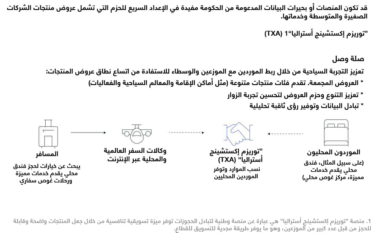 تتمتّع الحكومات اليوم بوضع جيد يمكّنها من التغلب على الفجوة الرقمية داخل القطاع وتحقيق تكافؤ في الفرص بالنسبة للشركات الصغيرة والمتوسطة. وتعتبر منصة "توريزم إكستشينج أستراليا" (Tourism Exchange Australia) التي أعدتها الحكومة الأسترالية مثالاً على التمكين على نطاق واسع، ذلك لأنها تمثّل صلة وصل تربط الموردين بالموزعين والوسطاء لإعداد حزم جذابة لشريحة معينة من السياح، ومن ثم تستخدم تجارب السيّاح لتقديم مزيد من الرؤى الثاقبة التحليلية لوسطاء السفر (الشكل 3). وتُتيح تلك الآلية لوكلاء السفر عبر الإنترنت تنويع عروضهم من خلال عرض مزيد من التجارب بعيداً عن المسار المألوف، وهو ما يزيد من جاذبية الوجهة الأسترالية، ويمنح الموردين الأصغر فرصة أفضل للوصول إلى الزبائن.