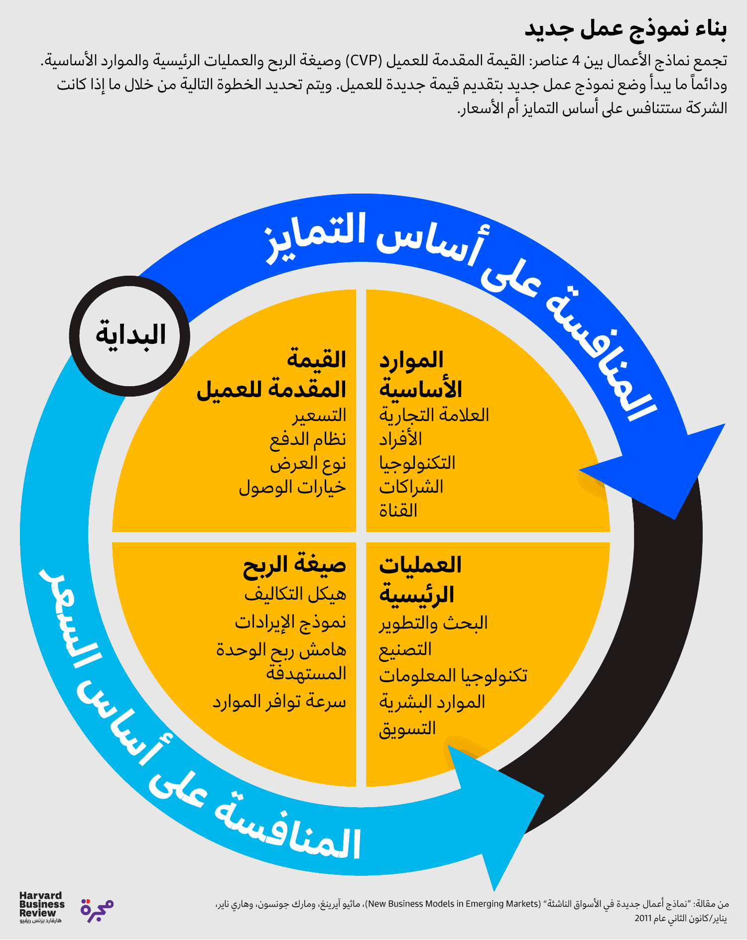 تجمع نماذج الأعمال بين 4 عناصر: القيمة المقدمة للعميل (CVP) وصيغة الربح والعمليات الرئيسية والموارد الأساسية. ودائماً ما يبدأ وضع نموذج عمل جديد بتقديم قيمة جديدة للعميل. ويتم تحديد الخطوة التالية من خلال ما إذا كانت الشركة ستتنافس على أساس التمايز أم الأسعار.