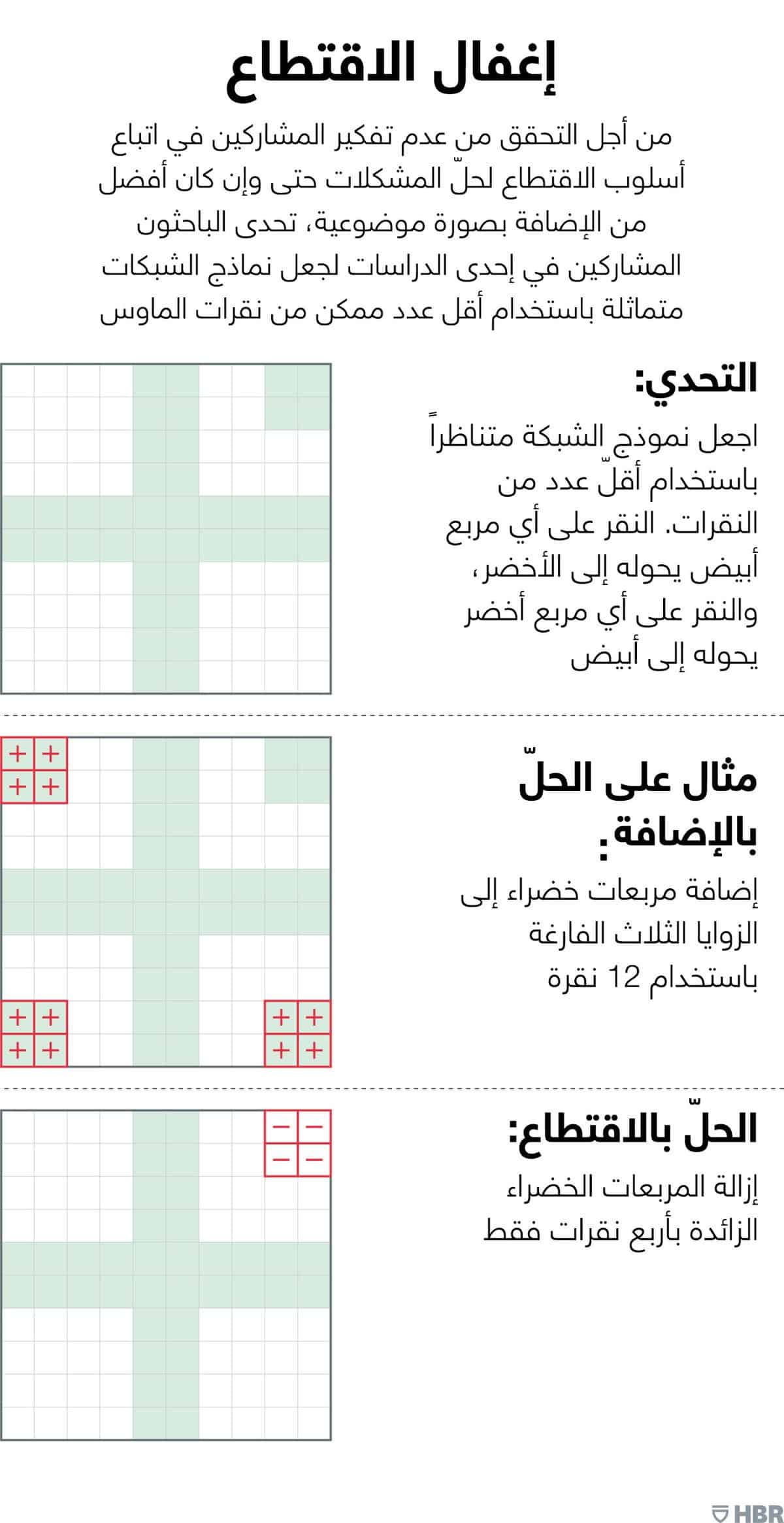 هل قفز المشاركون إلى الحلّ بإضافة مربعات خضراء إلى الزوايا الفارغة باستخدام 12 نقرة، أم لاحظوا حلّ الاقتطاع الأفضل المتمثل في حذف المربع الأخضر الزائد في الزاوية اليسارية العليا بأربع نقرات فقط؟ بدا لنا في هذه التجربة وغيرها أن الكثير من المشاركين تبعوا حدسهم الأول المتمثل في النزعة للإضافة ومضوا فيه من دون التفكير في خيار الاقتطاع، كما لاحظنا أن المشاركين الذين شتتنا انتباههم بطلب إكمال مهمة ثانية في نفس الوقت لجؤوا إلى الحلّ بالإضافة بنسبة أكبر. يوضح ذلك أنه عندما يتشتت انتباه الإنسان فعلى الأرجح أنه سيعتمد على الأجوبة المختصرة التي تتبادر إلى ذهنه أولاً.