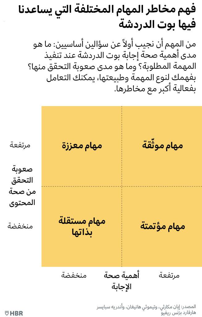 وسعياً إلى ذلك، يحدد بحثنا بُعدين رئيسيين للمخاطر المعرفية التي تطرحها بوتات الدردشة: إلى أي درجة تصل أهمية صحة ردود بوت الدردشة في إتمام المهمة بنجاح؟ وما هي درجة صعوبة التحقق من صحة ردود بوت الدردشة؟ تتطلب بعض مهام العمل معلومات على درجة عالية من المصداقية، ما يجعل من الضروري أن تكون ردود بوت الدردشة صحيحة ودقيقة. ومن أمثلة ذلك، المهام التي تتناول رفاهة الأفراد في مجالات السلامة والرعاية الصحية والتعليم. وفي المقابل ثمة مهام لا تتطلب دقة متناهية في ردود بوت الدردشة، مثل توليد أفكار لمنتج أو خدمة جديدة، أو ابتكار قصص لعمل ترفيهي، أو عمل إبداعي على تسمية علامات تجارية لمنتجات وتصميم شعارات تجارية لشركات.