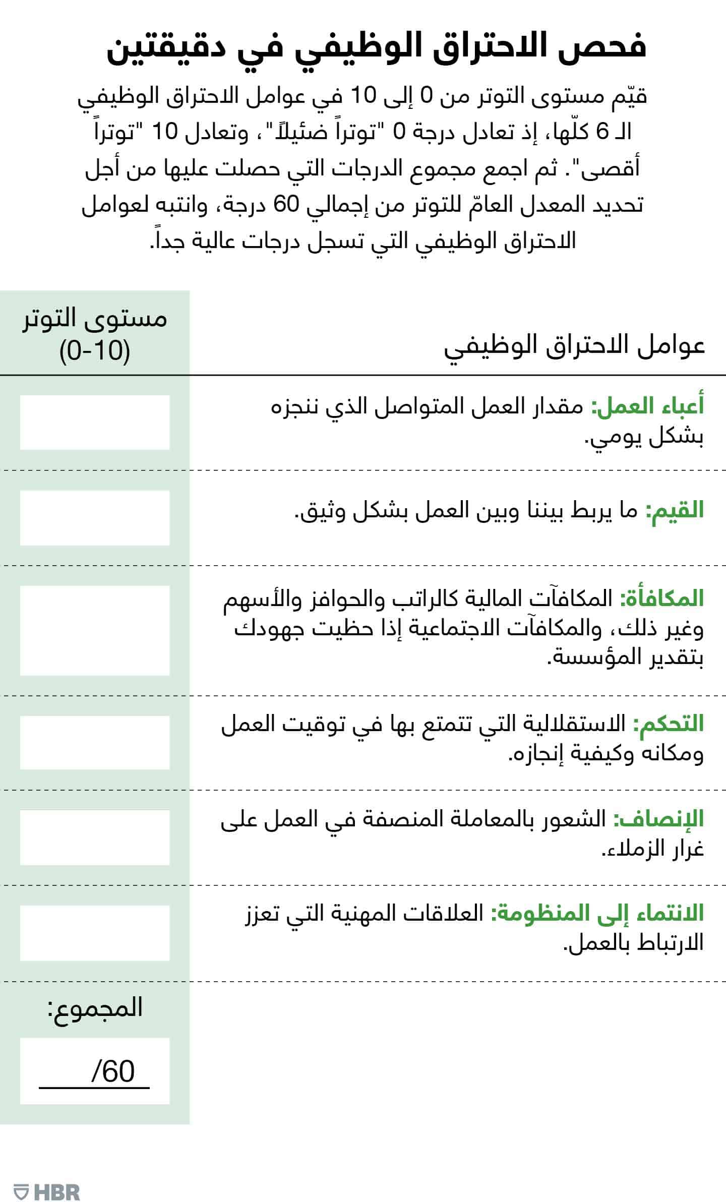 من أجل البدء بهذا الفحص سجّل درجة التوتر الذي تشعر به وفقاً لعوامل الاحتراق الوظيفي الستة، على سلم من 0 إلى 10 (0 تعني "توتراً ضئيلاً" و10 تعني "توتراً أقصى"). إذا كنت على سبيل المثال تجد صعوبة في التواصل مع زملائك بعد فترة طويلة من العمل عن بُعد، فيمكنك أن تضع درجة 8 في خانة عامل الانتماء إلى المنظومة. وفي المقابل يمكنك أن تضع درجة 2 في خانة عامل أعباء العمل، إذا كنت تواجه قدراً كبيراً من المهام لكنك قادر على تحمّلها. ويمكنك استخدام الجدول التالي لإنجاز هذا النشاط.