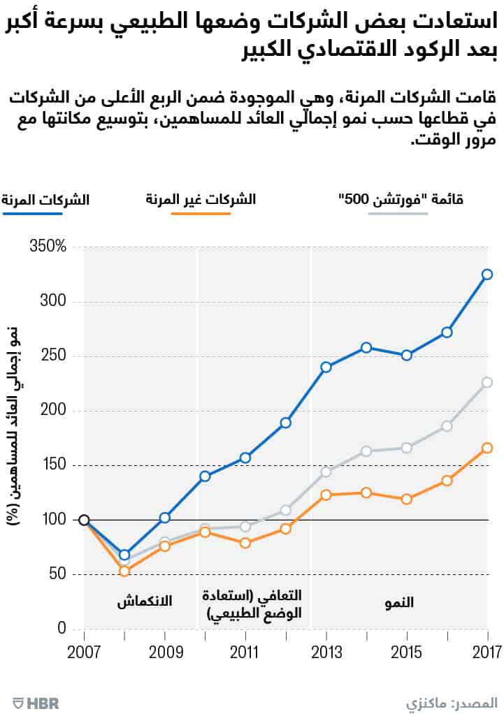 وقمنا بدراسة معنى أن تكون الشركة مرنة في فترة الركود من أجل استخلاص الدروس من فترات الانكماش الاقتصادي السابقة، ولمساعدة المسؤولين التنفيذيين في الإجابة على ذلك السؤال. وقمنا - على وجه التحديد - بتحليل هذه الأعمال التي لم تتمكن فقط من البقاء خلال فترة الانكماش السابقة، بل ازدهرت بالفعل. وركزنا على الشركات التي حققت إجمالي عائدات مرتفع على المساهمين (TRS) في قطاعاتها التجارية. وحققت هذه الشركات، التي أطلقنا عليها اسم "الشركات المرنة"، نسبة أعلى بـ 6% إلى 8% من إجمالي العائدات على المساهمين (حسب المجال) لدى نظرائها في القطاع. وانخفض أداؤها العام قليلاً خلال فترة الانكماش، وكانت قادرة على توسعة مكانتها بشكل كبير في القطاعات الخاصة بها خلال مرحلة الانتعاش الاقتصادي.
