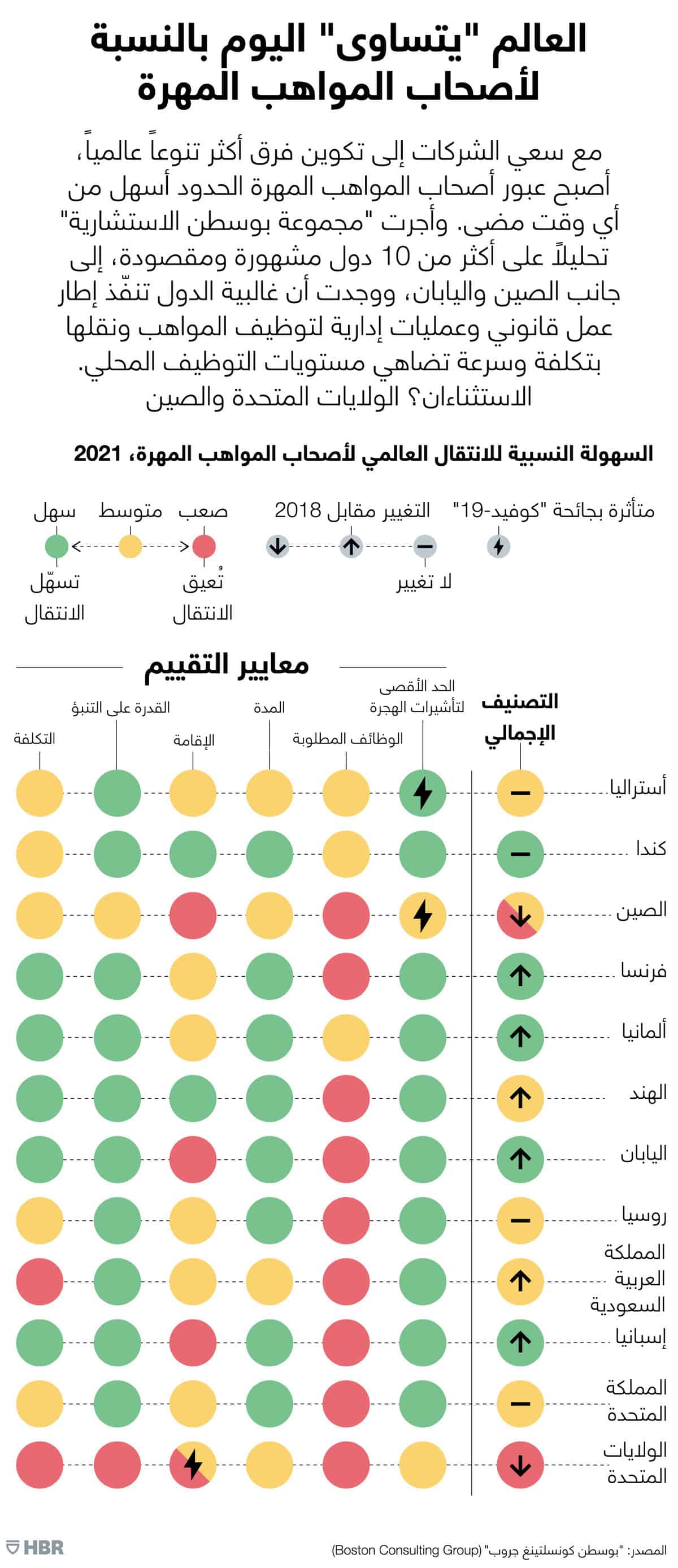 ومن منظور عالمي، أصبح عبور أصحاب المواهب المهرة الحدود اليوم أسهل من أي وقت مضى. وبشكل عام، يلجأ مزيد من الشركات إلى تكوين فرق متنوعة عالمياً، حيث أظهرت البحوث ميل معظم تلك الفرق إلى دفع عجلة الابتكار على مستوى الشركة وعلى المستوى القطري أيضاً. على سبيل المثال، تدرس ألمانيا اليوم طرح نظام تأشيرات قائم على النقاط لجذب أصحاب المواهب المهرة. وقدمت فرنسا تأشيرات جديدة لرواد الأعمال. كما تقدم اليابان فئة تأشيرة لأصحاب المواهب المتخصصين بالتكنولوجيا بشكل أساسي لكنها لا تقتصر عليهم أيضاً، وهي ليست معروفة على نطاق واسع. وحتى بعد خروج بريطانيا من الاتحاد الأوروبي، تبقى تأشيرة العمال المهرة القائمة على النقاط ركيزة أساسية لاستراتيجية إدارة المواهب في البلاد. وعلى الرغم من أن القيود التي فرضتها أستراليا في ظل جائحة "كوفيد-19" جعلت تنقل المواهب صعباً، من المتوقع أن تكون تلك ظاهرة عابرة.