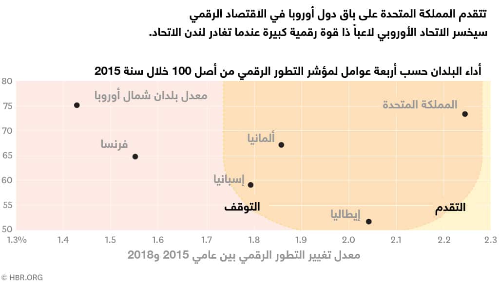 في مجال الاقتصاد الرقمي، سيخسر الاتحاد الأوروبي لاعباً مميزاً. ذلك أن القطاع الرقمي يُعدّ أحد القطاعات الأكثر ديناميكية وابتكاراً في اقتصادات المملكة المتحدة والاتحاد الأوروبي وفي كثير من البلدان الأخرى، ففي المملكة المتحدة وحدها، يمثل هذا القطاع 16% من الناتج المحلي، و10% من فرص العمل، و24% من الصادرات. وكجزء من تحليل مؤشرنا للتطور الرقمي 2017 (تطرقنا إلى نتائج التقرير بشكل أوسع هنا) الذي طورته كلية "فليتشر" (Fletcher School) وشركة "ماستركارد" (Mastercard)، حرصنا على تحليل أداء المملكة المتحدة مقارنة بأداء نظرائها من البلدان الأوروبية الكبرى.