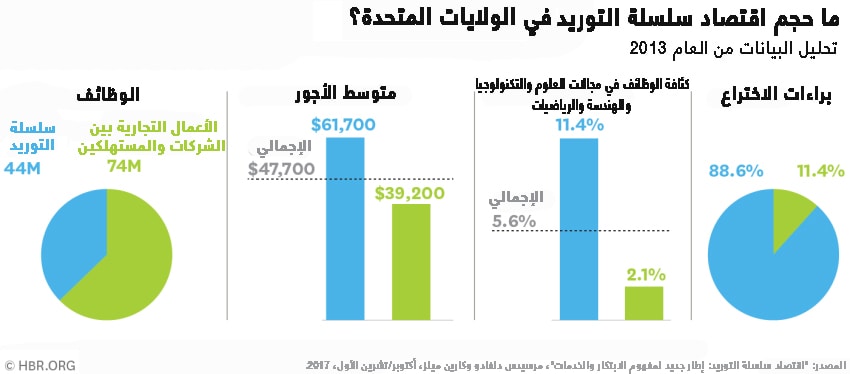 يتميز اقتصاد سلسلة التوريد في الولايات المتحدة بأنه اقتصاد ضخم ومختلف. ويمثل هذا الاقتصاد الصناعات التي تقوم ببيع المنتجات والخدمات إلى مؤسسات الأعمال وإلى الحكومة، وذلك خلافاً للمجالات الصناعية التي تتم فيها عمليات البيع بين الشركات التجارية والمستهلكين (وهو ما يعرف بـ B2C)، أي التي تبيع منتجات وخدمات لأغراض الاستهلاك الشخصي. وتشمل سلسلة التوريد الأميركية 37% من جميع الوظائف، ويعمل بها 44 مليون شخص. ونسب الأجور في هذه الوظائف أعلى من المتوسط بشكل ملحوظ، وهي مسؤولة عن معظم الأنشطة الإبداعية في الاقتصاد. وتمثل الوظائف في مجالات العلوم والتكنولوجيا والهندسة والرياضيات، والتي يُرمز لها بـ (STEM)، وتُعد مؤشراً على القدرات الابتكارية وهي أعلى بنسبة خمس مرات تقريباً في اقتصاد سلسلة التوريد عن نظيراتها في الاقتصاد القائم على عمليات البيع بين الشركات التجارية والمستهلكين. كما يتركز تسجيل براءات الاختراع بشكل كبير في المجالات الصناعية التي تقع ضمن سلسلة التوريد.