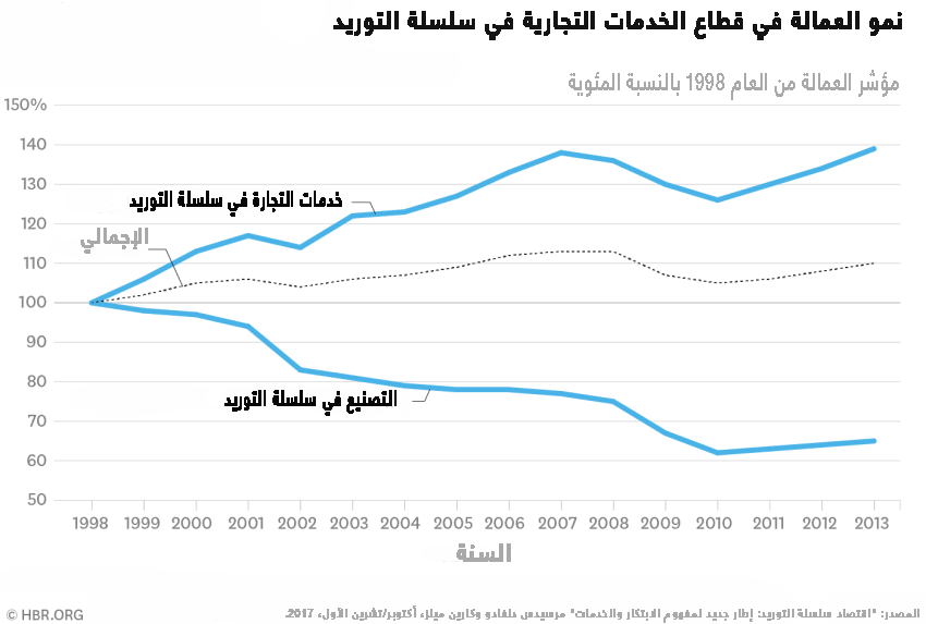 غير أنّ هذا التصنيف التقليدي الذي يركز على التصنيع بدلاً من الخدمات ما يزال قاصراً، حيث يعمل 10% فقط من حجم العمالة في مجال التصنيع في حين يتركز 90% منها في مجال الخدمات. وهناك اعتقاد شائع بأنّ معظم الوظائف الخدمية هي مهن منخفضة الأجور مثل وظائف المطاعم أو متاجر التجزئة، في حين أنّ الوظائف الصناعية تكون عادة أجورها مرتفعة. لكن ليست كل الخدمات متشابهة، ففي تصنيفنا الجديد يمكننا فصل الوظائف الخدمية في سلسلة التوريد – ذات الأجور الأعلى - عن الوظائف الخدمية "الاعتيادية" التي تميل إلى أن تكون نسب الأجور فيها متدنية بشكل أكبر. وتشمل الوظائف الخدمية في سلسلة التوريد هذه العديد من مهن العمل المختلفة، بداية من مدراء العمليات إلى مبرمجي الكمبيوتر وصولاً إلى سائقي الشاحنات، وتشكل حوالي 80% من العمالة في سلسلة التوريد بمتوسط أجر سنوي قدره 63,000 دولار وتنمو بشكل سريع.