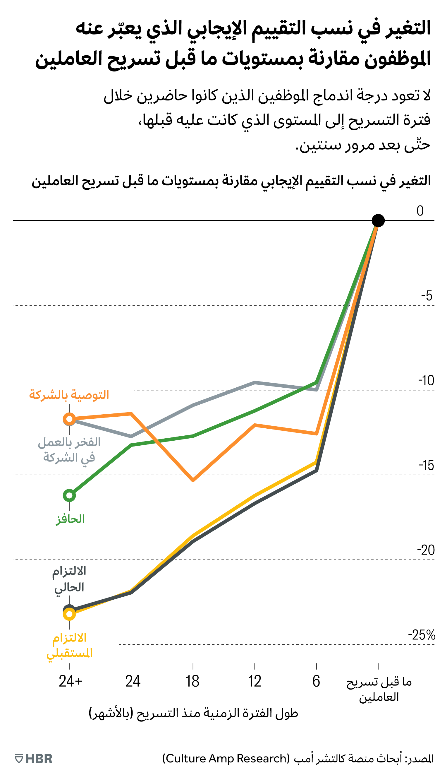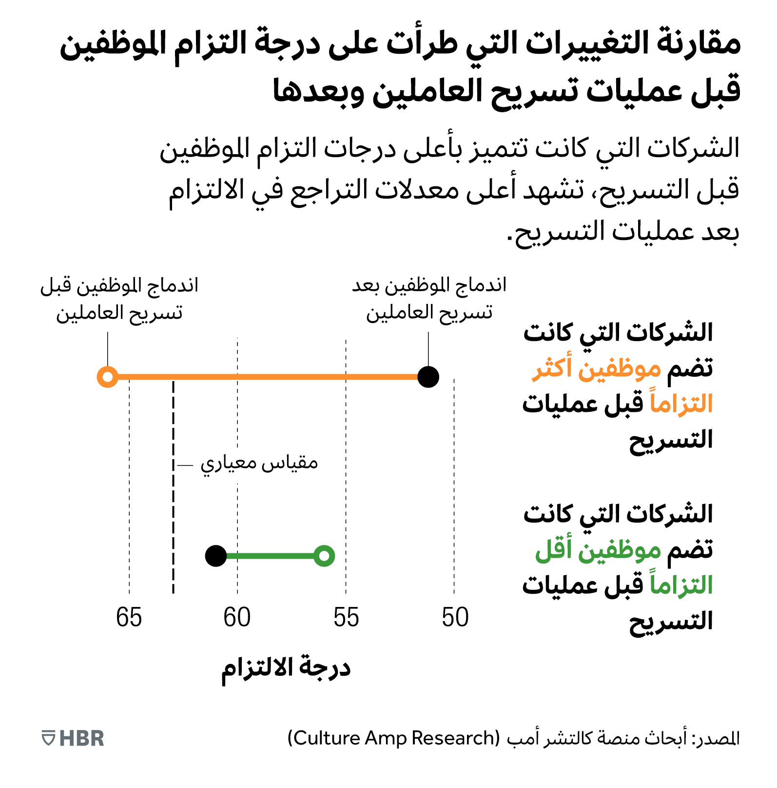وفي حالة الموظفين الذين ينجون من عمليات التسريح، فإن التزامهم بالبقاء في الشركة يستمر في التراجع بمرور الوقت، ويمثل هذا الميل مؤشراً قوياً على الدوران الوظيفي الفعلي.