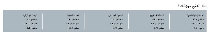 تعليمات تسجيل النتائج: قم بحساب متوسط ​​النقاط لكل بُعد (اعكس درجات البنود التي تأتي أسفل بُعد تحمل الضغوط). من خلال مقارنة نتائجك مع نتائج عينة تمثل الأشخاص من مواطني الولايات المتحدة، يمكنك تحديد مستواك في كل بُعد، سواء كان منخفضاً أو متوسطاً أو عالياً. راجع الصفحة التالية لتفسير نتائجك.