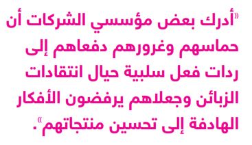 عدم الإصغاء لآراء الزبائن. حتى المؤسّسين الذين عقدوا صفقات بيع مبكرة أفادوا أنهم كانوا منهمكين في التركيز على إقناع الزبائن المحتملين بمزايا المنتج الجديد ولم يولوا الاهتمام اللازم لاستكشاف ومعرفة آراء أولئك الزبائن بفكرة ذلك المنتج. وأدرك بعضهم أن حماسهم وغرورهم دفعاهم إلى ردات فعل سلبية حيال انتقادات الزبائن وجعلاهم يرفضون الأفكار الهادفة إلى إحداث تغييرات وجدوها فيما بعد أساسية لزيادة فرص تسويق عروضهم. وحسب نصيحة أحد رواد الأعمال الذين قابلناهم، عليك أن "تصغي إلى آراء وملاحظات زبائنك وتعيد صياغة فكرتك ومنتجك بما يلبّي متطلباتهم الحقيقية"؛ في حين وصف رائد أعمال آخر العملية كالتالي: "تتمثّل العملية بأكملها في فهم "مكامن وجع" السوق وما يتطلبه فعلاً، والسبيل الأمثل إلى ذلك هو التحدث مع زبائن محتملين والتحقق من مدى تلبية فكرتك لتلك المتطلبات مرة تلو الأخرى". وكما أفاد أحد رواد الأعمال الأميركيين الناجحين: "لم يكن الهدف من عرضنا التقديمي أمام الزبائن تقديم شرح لما نقوم به فحسب؛ بل أيضاً الإيحاء بأننا نشرح ما نقوم به، في حين كنا نحاول فعلاً استخلاص معلومات عن أعمال الزبائن، وعما يمكننا تقديمه لمساعدتهم".