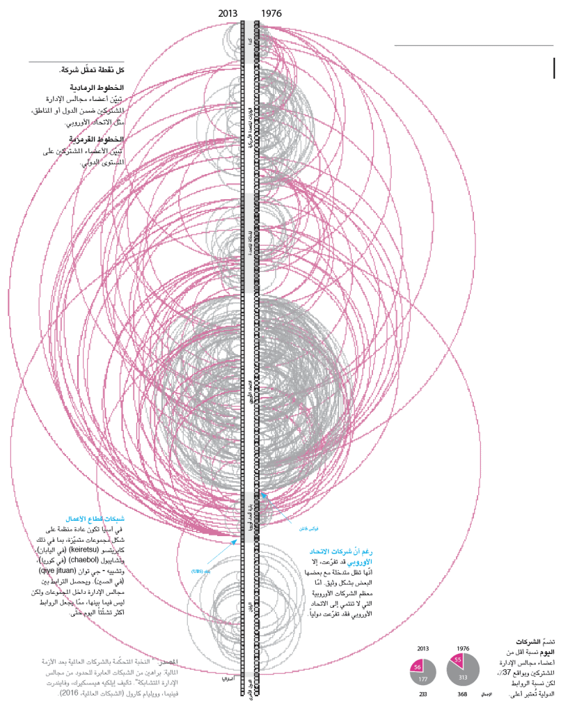 في مسعى من مجموعة من الباحثين بقيادة إيلك هيمسكيرك من جامعة أمستردام لمعرفة مدى ترابط مجالس إدارة الشركات في أنحاء العالم، عمل أعضاؤها على وضع رسم بياني نقطي لتحديد عضويات مجالس الإدارة المشتركة بين 176 شركة كبيرة في العامين 1976 و2013. تمثّل كل نقطة شركة واحدة؛ أمّا الخطوط التي تربط بينها فتمثّل أعضاء مجلس الإدارة المشتركين.