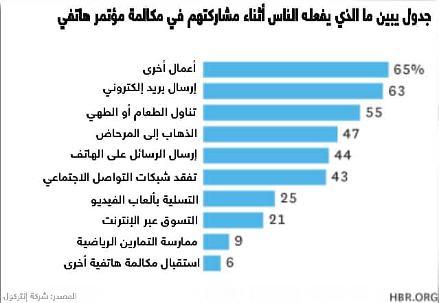 ولا عجب في هذه النتيجة، فإضافة إلى السهولة التي يجدها الناس في استعمال هذا النوع من الأجهزة، فإنهم غالباً ما يرون في المؤتمرات والاجتماعات الهاتفية فرصة يمكن اغتنامها للقيام بالكثير من النشاطات الأخرى: