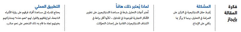 هم محقّون في شعورهم بهذا الإحساس حول موضوع الإبداع في الاستراتيجية وهذا لا يعني القول إنهم يجب أن يتخلوا عن العديد من الأدوات التحليلية التي طوّرناها على مدار السنين. فنحن سنظل بحاجة إليها لفهم السياقات التنافسية وتقييم الطرق الفضلى التي يجب على الشركات أن تسخّر مواردها وكفاءتها بها ضمن هذه السياقات. لكن يجب علينا أيضاً نحن من نكرس حياتنا المهنية للتفكير في الاستراتيجية أن نقرّ أن مجرد منح الناس هذه الأدوات لن يساعدهم على التخلي عن طرق التفكير التقليدية. وإذا ما أردنا أن ندرّس الطلاب – والتنفيذيين – كيف يضعون استراتيجيات قادرة على تحقيق اختراقات، فإننا يجب أن نمنحهم أدوات مصمّمة خصّيصاً لتعزيز الإبداع.