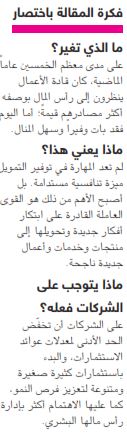 غير أن جميع هذه الإجراءات المعززة للإنتاجية تتطلب أناساً موهوبين يبتكرون هذه الإجراءات وينفذونها على أرض الواقع. وهكذا نرى أن رأس المال البشري، المتمثل في وقت ومواهب وطاقات العاملين في الشركة إضافة إلى الأفكار التي يبتكرونها ويطبقونها، يشكّل في العصر الجديد أساس التفوق في الأداء. وبغض النظر عن كل شيء فإن فكرة عظيمة واحدة من شأنها أن ترفع الشركة إلى القمة وتبقيها فيها لسنوات عدة. خذ مثالاً على ذلك فكرة "آي فون" في شركة "آبل"، أو فكرة توظيف الحفر الأفقي لاستخراج النفط والغاز لدى شركة "كونتيننتال ريسورسز" أو فكرة إعادة تصوّر أثاث المنزل لدى شركة "إيكيا". فضلاً عن ذلك، من الممكن أن يؤدي عدد كبير من الأفكار اليومية الصغيرة أيضاً إلى دفع عجلة الشركة نحو الأمام وتمكينها من تجاوز منافسيها.