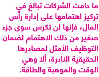 غير أن الأفكار العظيمة في عصر المال لا تتجسد من تلقاء ذاتها، بل تنبع من الأفراد والفرق الذين يوظفون وقتهم في العمل المنتج ومهاراتهم لإحداث تغيير مميّز، ويستثمرون طاقاتهم الإبداعية وحماسهم في صالح أعمالهم. وما دامت الشركات تبالغ في تركيز اهتمامها على إدارة رأس المال، فإنها لن تكرس سوى جزء صغير من ذلك الاهتمام لضمان التوظيف الأمثل لمصادرها الحقيقية النادرة، ألا وهي وقت ومواهب وطاقات موظفيها. وفي الواقع، فإن معظم الشركات تخسر ما يقارب ربع طاقتها الإنتاجية لامتلاكها بنى وانتهاجها آليات وممارسات من شأنها أن تضيع الوقت وتقوض الأداء. ولا تقوم تلك الشركات بمواجهة تلك الخسارة سوى بشكل جزئي من خلال توظيف الكفاءات المتميزة والاستثمار الأمثل لقواها العاملة.