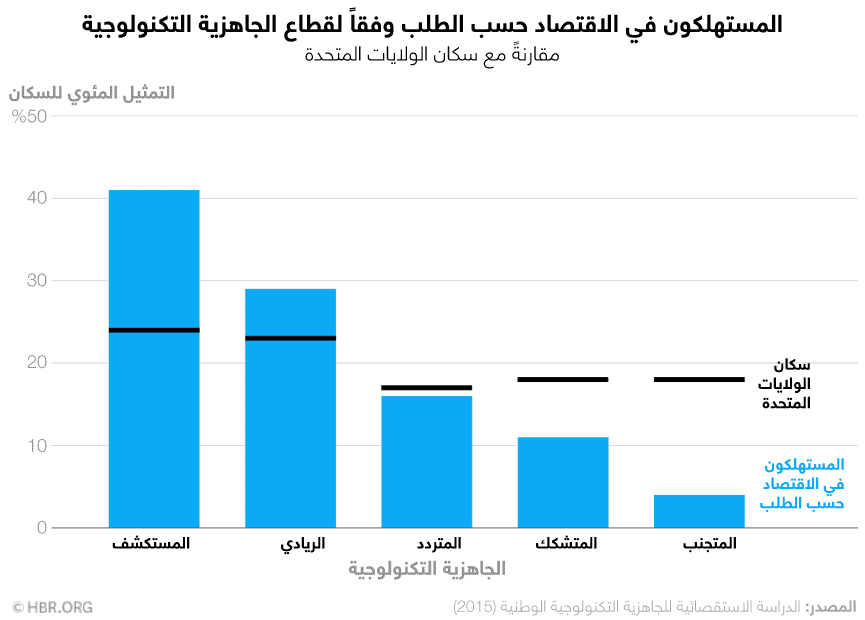 كما صنفت الدراسة الاستقصائية للجاهزية التكنولوجية الوطنية المستهلكين حسب قطاعات استناداً إلى جاهزيتهم التكنولوجية. حيث يعدّ "المستكشفون" الفئة الأكثر إبداعاً وتفاؤلاً فيما يتعلق بالتكنولوجيا فهم من الرواد، ويشكلون 41% من إجمالي المستهلكين في الاقتصاد حسب الطلب. كما يرتبط "الرواد الأوائل" بعلاقة حب أو كراهية بالتكنولوجيا فهم يمثلون 29% من المستهلكين حسب الطلب، أما "المترددون"، فلديهم نظرة متفائلة للتكنولوجيا ولكنهم يشعرون بقدر من عدم الارتياح والخوف، ويمثلون 16% من المستهلكين في الاقتصاد حسب الطلب. ومن ناحية أخرى يفتقر "المتشككون" إلى العاطفة في تعاملهم مع التكنولوجيا ويشكلون 11% من إجمالي المستهلكين في الاقتصاد حسب الطلب. وفي المقابل، لا يجد "المتجنبون" ضعيفو الأداء التكنولوجي أي فائدة تذكر من التكنولوجيا، ومن غير المستغرب أن يشكلوا 4% فقط من إجمالي المستهلكين في الاقتصاد حسب الطلب، وهو معدل أقل بكثير من معدل "المتجنبين" الذي بلغ 18% بالنسبة لتعداد السكان في الولايات المتحدة كلها.