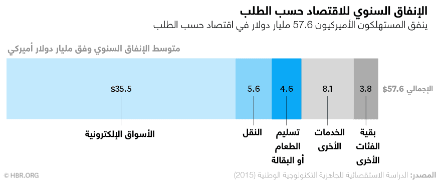 يجتذب الاقتصاد حسب الطلب أكثر من 22.4 مليون مستهلك ينفقون 57.6 مليار دولار سنوياً. إذ تذهب الحصة الأكبر من الإنفاق حسب الطلب إلى الأسواق الإلكترونية (على سبيل المثال: "إي باي" (Ebay) و"إتسي" (Etsy))، وذلك مع 16.3 مليون زيارة من قبل المستهلكين شهرياً لهذه الأسواق حيث ينفقون ما يقرب من 36 مليار دولار سنوياً. بينما يحتل قطاع النقل المرتبة الثانية (على سبيل المثال: شركة "أوبر" (Uber)، وشركة "ليفت" (Lyft))، وذلك مع 7.3 ملايين مستهلك شهرياً ينفقون 5.6 مليارات دولار سنوياً، يليه قطاع تسليم الطعام أو البقالة (على سبيل المثال: "إنستاكارت" (Instacart))، مع 5.5 ملايين مستهلك شهرياً ينفقون 4.6 مليارات دولار سنوياً. إضافةً إلى خدمات حسب الطلب الأخرى التي تتضمن الخدمات المنزلية (على سبيل المثال: "تاسكرابيت" (TaskRabbit))، والخدمات المستقلة (مثلاً: "إيلانس" (Elance))، وخدمات الصحة والجمال (مثلاً: "ستايل سيت" (StyleSeat))، التي تحقق إجمالي إنفاق 8.1 مليارات دولار أميركي سنوياً، بينما تحقق بقية الأنشطة الأخرى حسب الطلب ما يقرب من 3.8 مليارات دولار أميركي سنوياً.