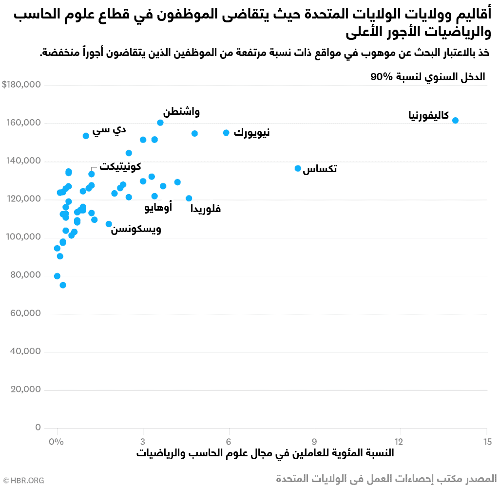 مصدر للتزويد بالعاملين: يعتبر عدد المرشحين المتوفرين أمراً رئيسياً عند البحث عن عامل موهوب. ويوضح المخطط أدناه أقاليم وولايات الولايات المتحدة حيث يتقاضى العاملون في قطاع علوم الحاسوب والرياضيات أعلى نسبة من الرواتب. تعد الولايات ذات النسبة المرتفعة من تعداد الموظفين في قطاع محدد مع نسبة منخفضة من الأجور أرضاً خصبة للتوظيف. فقد تحتوي هذه الولايات على مرشحين مستعدين لتغيير أماكن عملهم بحثاً عن فرص أفضل.