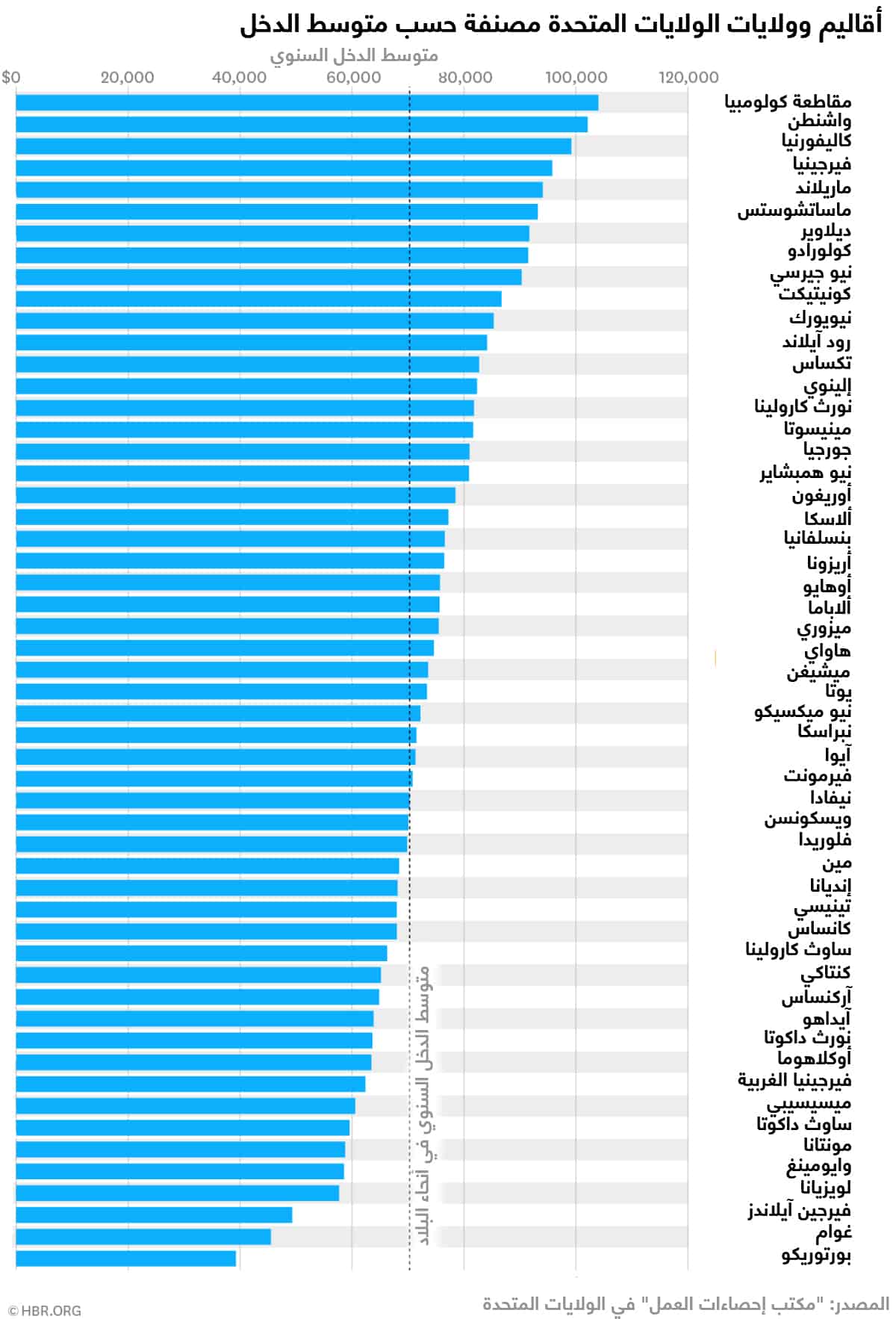 الراتب: باستخدام قواعد البيانات العامة، سيتمكن مدراء التوظيف من تقدير أي الولايات التي تدفع أجوراً أعلى من المتوسط الوطني، وأيها تدفع أجوراً أقل منه. وبالتالي، سيتمكن المعنيون بالتوظيف من تحديد الوجهة الجغرافية لنشر إعلاناتهم في ولايات محددة حيث يحقق المرشحون مكاسب أقل. سيساعد ذلك في زيادة احتمالية جذب عمال ماهرين من خلال تقديم رواتب أعلى من التي يمكن أن يتقاضاها المرشح المحتمل محلياً أو في ولاية مجاورة. يوضح المخطط التالي أي الولايات التي يقل متوسط الأجور فيها عن المتوسط الوطني وذلك في قطاع وظائف الحواسيب والرياضيات.