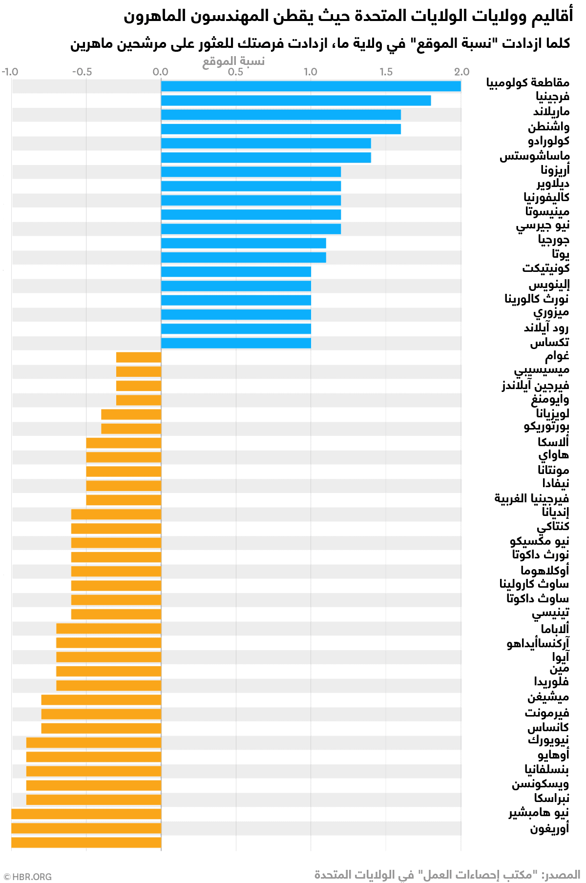 الموقع: يظهر المخطط أدناه أي الولايات تمتلك الأفضلية بالنسبة للفئة الوظيفية (علوم الحاسوب والرياضيات)، والمصنفة وفق "مكتب إحصاءات العمل"، التي بدورنا أسميناها على المخطط "مهندسون ماهرون". وتُحسب تلك الأفضلية وفقاً لمفهوم "نسبة الموقع" (location quotient)، وهو عبارة عن طريقة لاكتشاف مدى تركيز وجود صناعة معينة في منطقة أو مدينة ما مقارنةً بالبلد أو الإقليم بأكمله. وتظهر البيانات المفتوحة للوظائف النسبة المئوية للقوى العاملة التي تشغل مهنة محددة على الصعيدين المحلي والوطني. وينتج عن تقسيم هذه النسب المئوية حساب "نسبة الموقع". ولمزيد من التوضيح، لنأخذ هذا المثال. إذا شغل مبرمجو الحواسيب نسبة 10% من الموظفين محلياً ونسبة 2% من الموظفين وطنياً، فإن "نسبة الموقع" هنا تكون 5 (بقسمة الأخير على الأول). وكلما ازدادت "نسبة الموقع"، ازدادت الفرصة لمدراء التوظيف للعثور على مرشحين ماهرين. ما يعني أن الولايات ذات القيمة المنخفضة في "نسبة الموقع" يمكن أن تكون هدفاً للمهندسين الموهوبين الذين يبحثون عن تحديات أكبر.