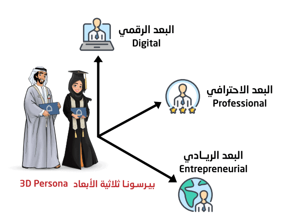 تتألف "البيرسونا ثلاثية الأبعاد" من ثلاث سمات أساسية تجسد ملامح خريجي المستقبل وهي: البعد الرقمي والبعد الاحترافي والبعد الريادي، وستضمن هذه السمات الثلاثية للخريجين ليس فقط الجاهزية في التعامل مع وظائف لم توجد بعد، بل مع تحديات لم تحدث بعد.