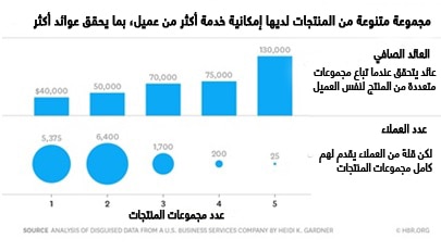 اقنع بالدليل الكمي. سخّر البيانات الداخلية لمبيعاتك لتظهر للناس أنّ التعاون الذكي ليس مجرد شيء يجب أن يكون موجوداً، بل هو ميزة استراتيجية أساسية للحصول على حصة سوقية. مثلاً، توضح الشرائط في المخطط أدناه كم يزيد موظفو المبيعات العائد من كل عميل عندما يعمل الأفراد خارج حدودهم لبيع منتجات متعددة. لكن الدوائر، التي توضح كيف أنّ قلة من العملاء فقط يحصلون على كامل المنتج، تبيّن أن هناك الكثير من الإمكانات التي من الممكن استغلالها.