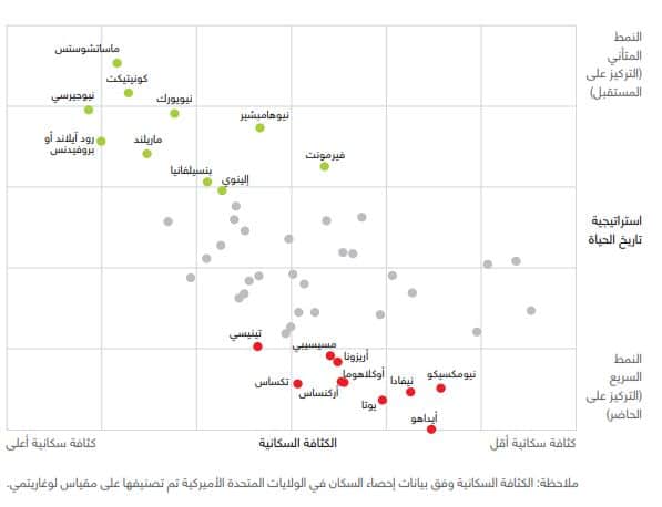 «تقييم الحياة والتاريخ» الذي يجمع بين متوسط سن الزواج ونسب الخصوبة والالتحاق بالتعليم العالي ووضع الأطفال في الحضانة والانخراط في برامج التقاعد، يظهر أنّ الناس في الولايات ذات الكثافة السكانية الأعلى يميلون للتركيز على الاستراتيجية "المتأنية" (الاستثمار في المستقبل)، أما سكان الولايات الأقل كثافة سكانية فيميلون إلى الاستراتيجية "السريعة" (التي تركز على الحاضر).