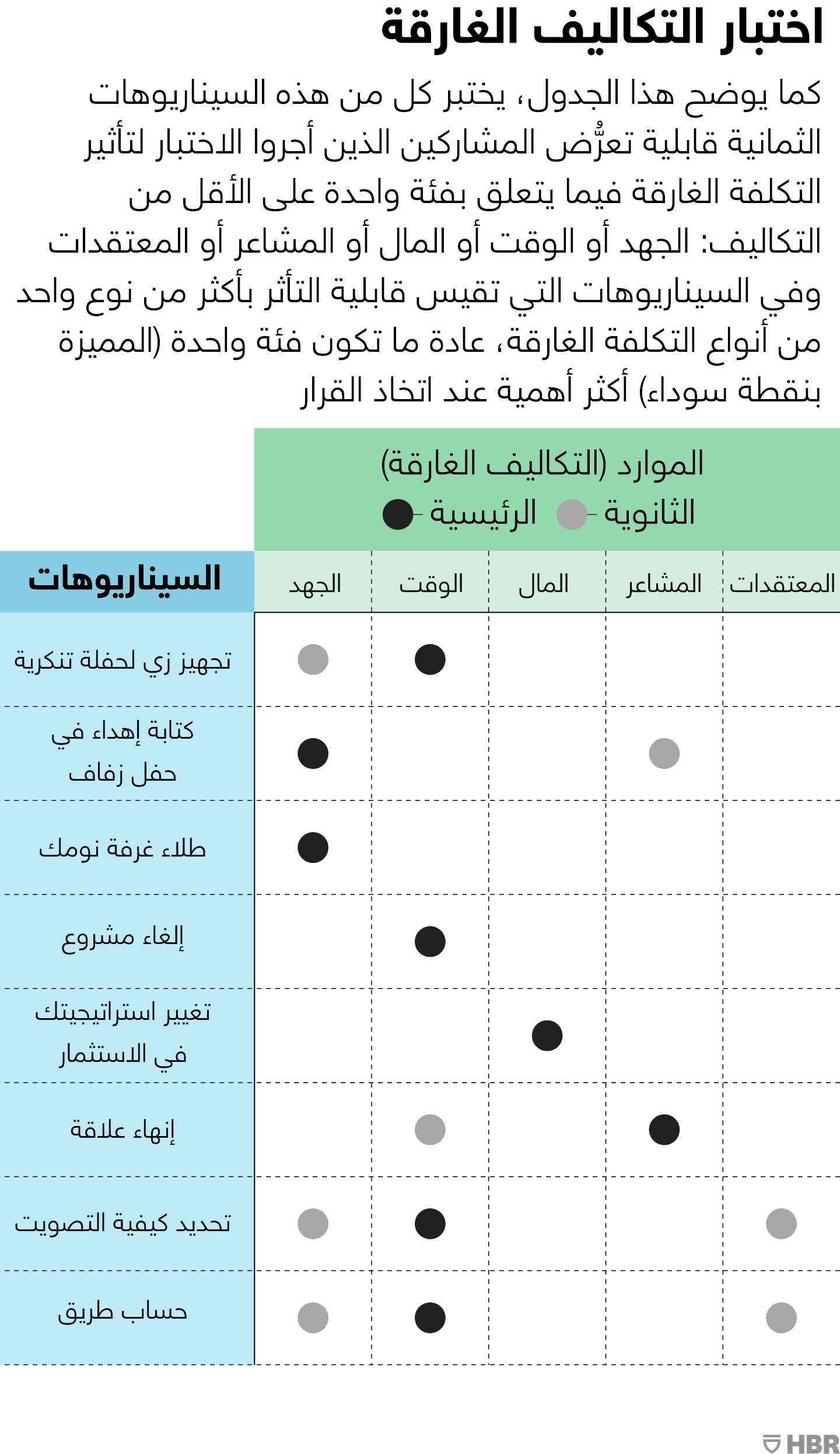 يساعد بحثي الأخير الذي أجريته مع دانيال غروي وأنتوني توكويل بعنوان "تقييم تأثير التكلفة الغارقة"، في سد هذه الفجوات ويوفر مقياساً جديداً من 8 أسئلة لقياس قابلية التعرض لهذا التأثير. يعرض كل سيناريو موقفاً واقعياً من الحياة اليومية يمكن أن يتخيل أي شخص نفسه فيه بسهولة. والسيناريوهات بمجملها تغطي مجموعة من التكاليف التي يمكن أن تغرق. في معظم الحالات، تغرق مجموعة متنوعة من التكاليف لأن مواردنا عادة ما تكون شديدة الترابط. على سبيل المثال، لا تتطلب العديد من القرارات المهمة المزيد من التكاليف الملحوظة والقابلة للقياس مثل الوقت والمال فقط، ولكن أيضاً ما نشعر به على الصعيد الشخصي مثل الجهد والمشاعر، وقد يشعر كل منا بحجم هذه التكاليف على نحو مختلف. لهذه الأسباب يبدو أنه من غير المرغوب وغير المجدي أيضاً محاولة الإشارة دائماً إلى نوع واحد فقط من الموارد في كل سيناريو أو عرض السيناريوهات التي تُبرز مورداً واحد فقط. بدلاً من ذلك، من المهم تضمين السيناريوهات التي تُبرز مزيجاً مختلفاً من الموارد.